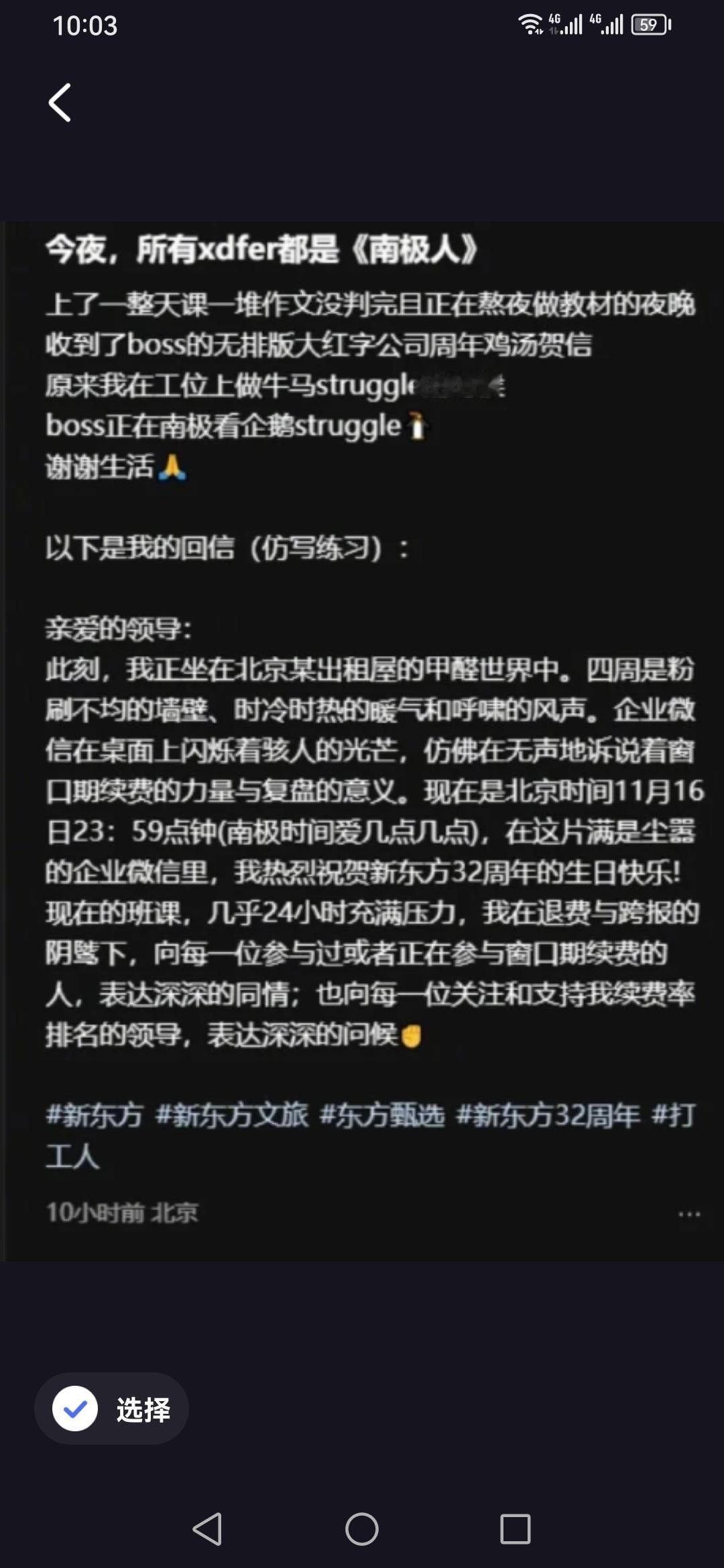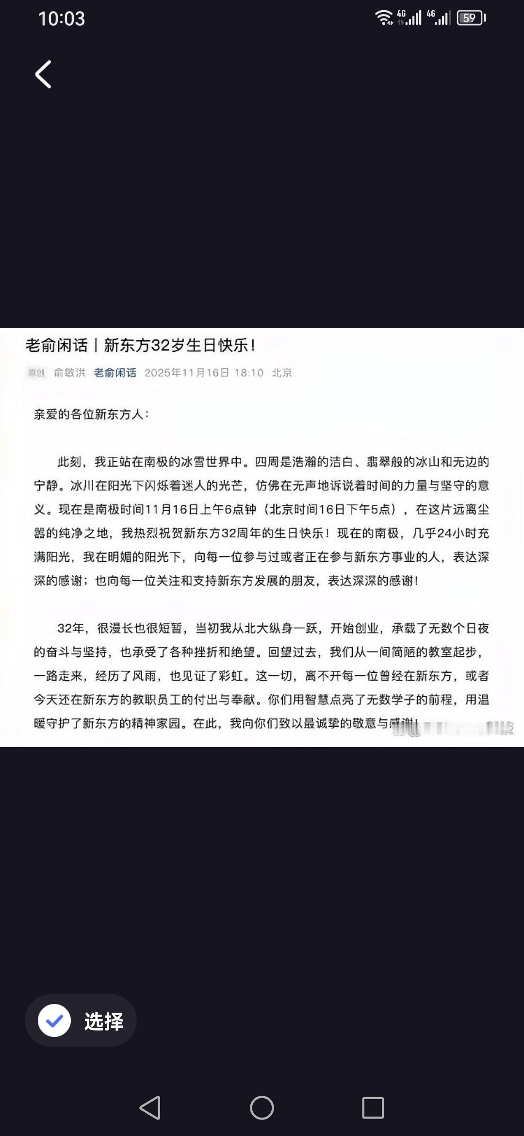 新东方32周年纪念日,俞敏洪南极发内部信,本想鼓励员工,没想到却引发员工集体吐槽,这究竟是怎么回事? 新东方创始人俞敏洪在公司32周年纪念日当天,身处南极却心系员工,发布了一封内部信。他希望通过分享企鹅相互扶持越冬的情景,来鼓励员工们团结一心。然而,这封信却意外在网络上引起了轩然大波。员工们纷纷表示,无法与正在享受“诗与远方”的老板产生共鸣。有员工直言:“您在南极看冰山,我在出租屋看数字。”更有教育板块员工透露,纪念日当天仍在加班做续费方案,看到信中对南极风光的描述,只觉得讽刺。细心的网友还统计出,信件全文提及17次“我”和5次“南极”,却对员工的压力只字未提。这一事件无疑戳中了打工人的集体痛点,让大家开始重新审视企业管理理念和员工福利之间的平衡问题。 企业管理理念与员工福利之间的平衡,一直是职场中的热门话题。俞敏洪的这封内部信,无疑再次引发了大家的广泛讨论。对此你怎么看?快来评论区留下你的看法吧!俞敏洪 老罗俞敏洪 俞敏洪商业模式 新东方商业模式 俞敏洪旅行随笔 俞敏洪个人品牌