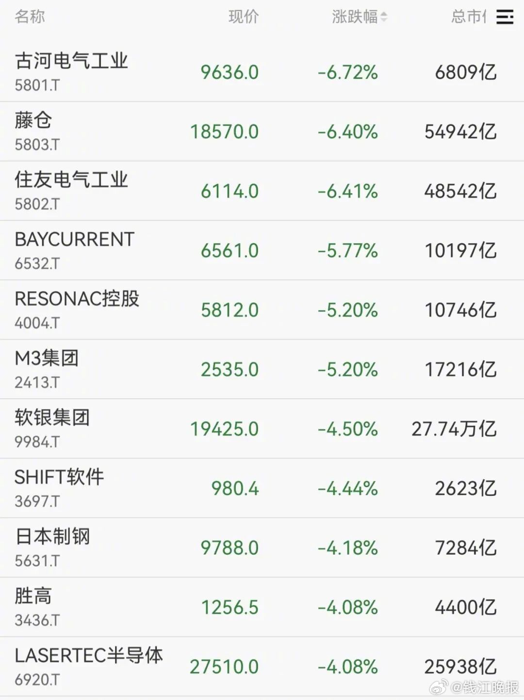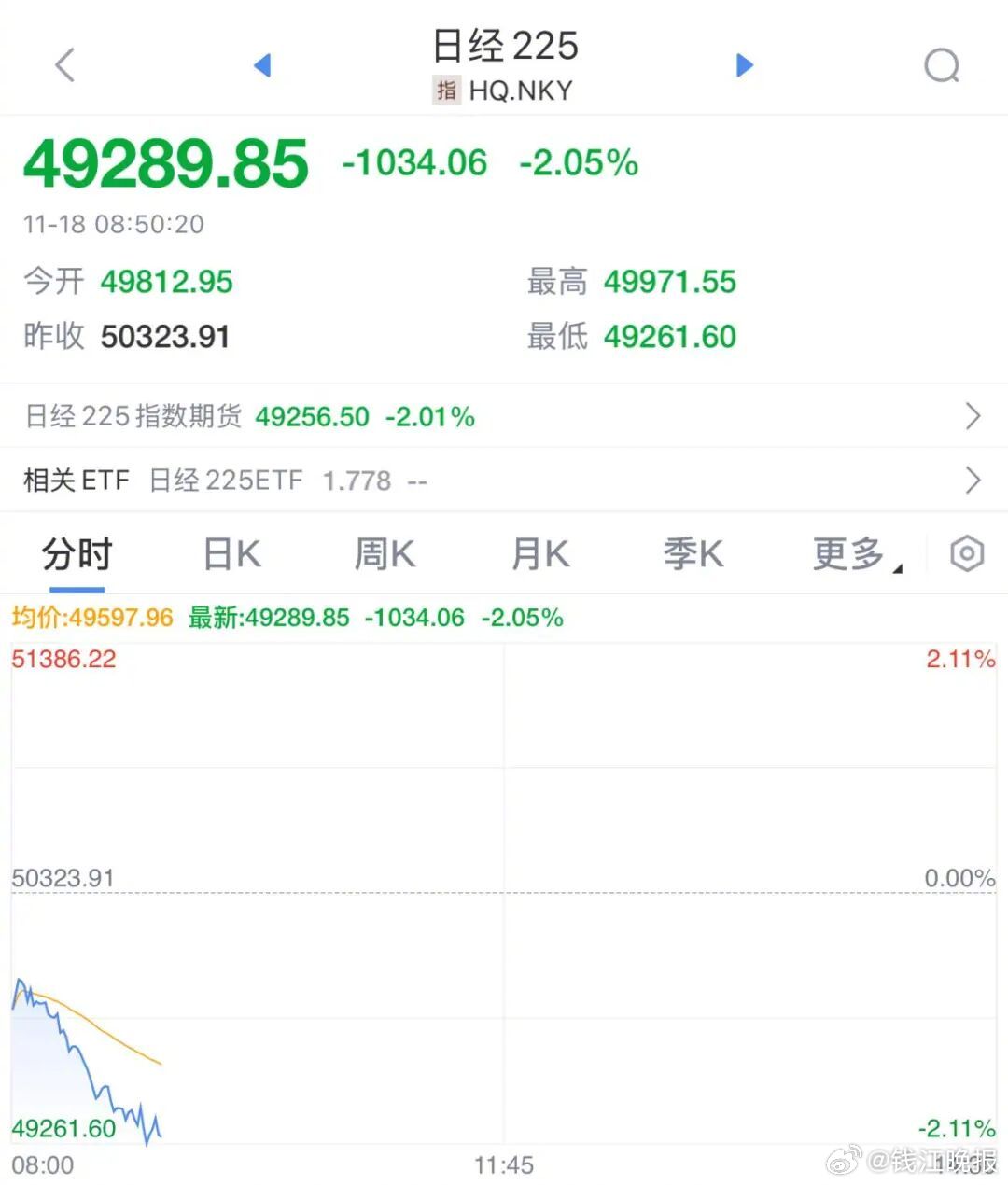 11月18日,日本股市开盘再度走低,日经225指数下跌超1000点,跌幅超2%。日本东证指数快速跳水,跌超1.5%,现报3297.14点。 个股方面,受隔夜美股科技股走低影响,软银集团一度跌超5%,东京电子、爱德万测试、任天堂等跟跌。此外,资生堂、味之素、迅销等消费股纷纷走低。消息面上,日本《每日新闻》17日报道称,针对高市早苗的言论,中国的反对态度持续强化。长期接待大量中国游客的大阪,目前已出现大量预订被取消的情况,当地业者担忧,“若局势长期持续,将产生更大影响”。报道称,大阪餐饮界人士称,此前就已担忧10月大阪世博会闭幕后的经济下滑。 日本共同社17日引述野村综合研究所经济学家木内登英的预测称,如果中国赴日游客数量大幅下滑,可能令日本今后一年旅游消费收入减少约2.2万亿日元,日本国内生产总值(GDP)将被拉低0.36%。日本政府此前曾预测2025年日本潜在经济增长率为同比上升0.6%。木内登英称,中国游客的减少将导致日本GDP增长率降低一半,凸显其对日本经济冲击之大。 据CCTV国际时讯报道,日本舆论认为,日本首相高市早苗的错误言论将导致日本经济受到进一步冲击。彭博信息研究公司分析师还指出,不排除今后中国消费者在国内减少购买日企产品,这可能对部分日系品牌造成冲击。 据央视新闻报道,高市早苗近日发表的涉台错误言论罔顾法理和历史事实,一系列言行危害地区稳定、祸及日本自身。日本媒体指出,高市是第一位将所谓“台湾有事”与“存亡危机事态”直接挂钩的日本领导人,武力介入台海局势的意图暴露无遗。 日本《社会新报》批评称,高市早苗的施政演说也充斥着鹰派政策,包括但不限于提前完成防卫费增额目标、创建“国家情报局”、制定反间谍法、放宽武器出口规则等,这只能被视为蓄意推高紧张局势。高市早苗的存在本身可能成为日本的存亡危机。除了日本股市之外,11月18日开盘,韩国股市也显著下挫。截至发稿,韩国综合指数跌幅超1.7%。(中国基金报)
