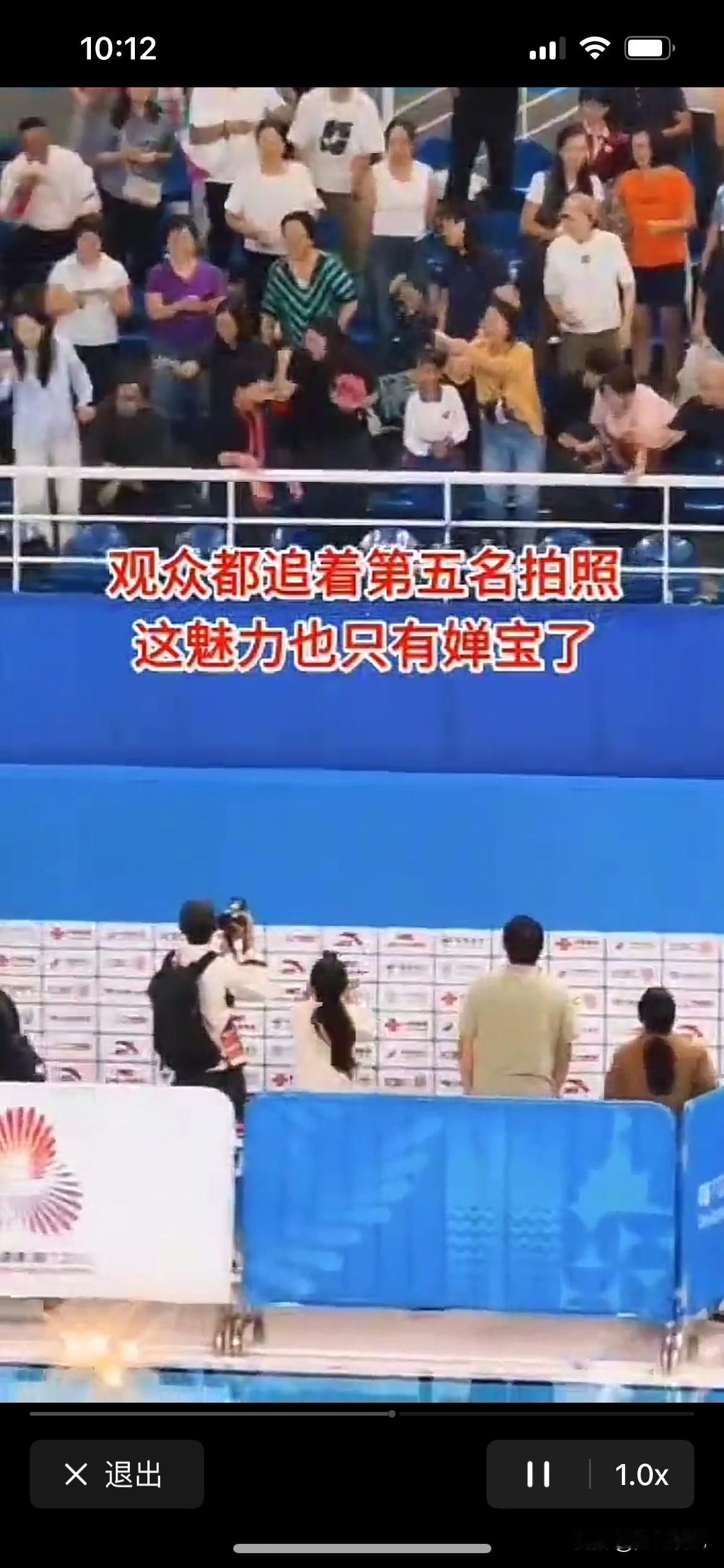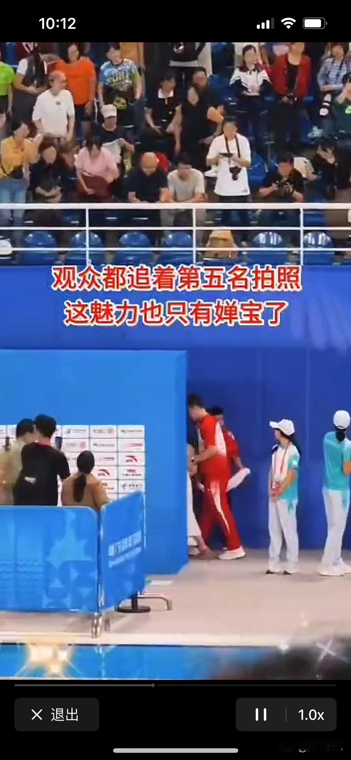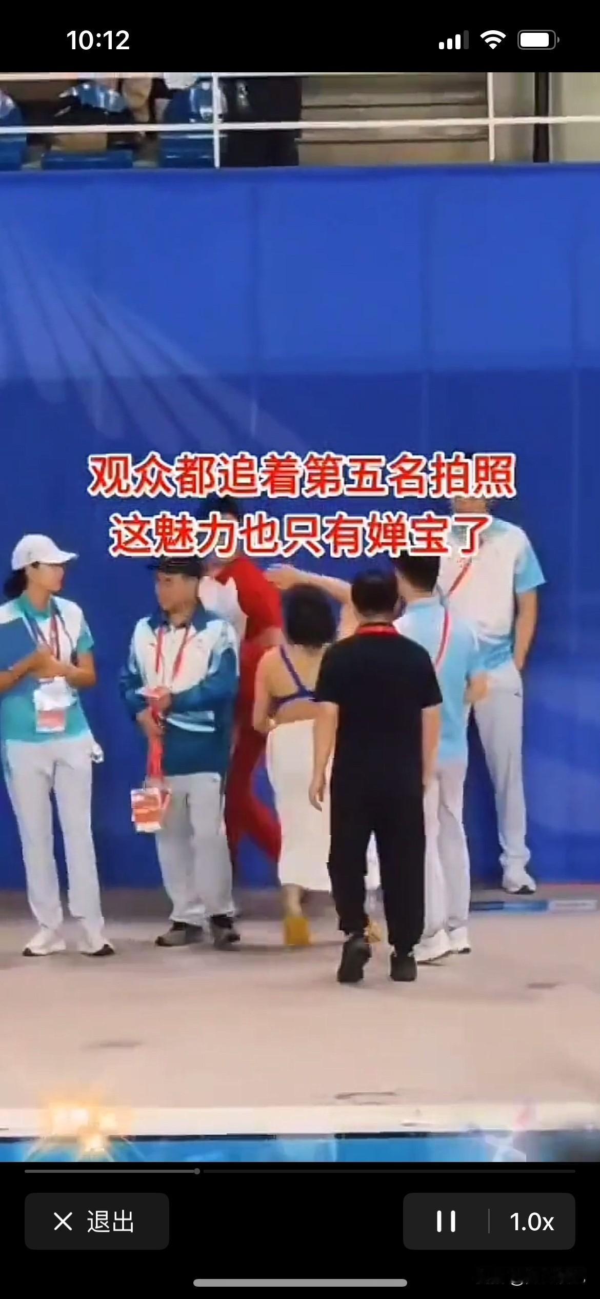 全红婵这次又让给了陈芋汐,第一名的陈芋汐采访的记者寥寥无几,而一波记者涌向第五名全红婵,第五名也把冠军的光环给抢了,全红婵意识到不对劲,赶紧撤离现场。 全红婵的人气太火爆了、太汪了,把得了冠军的人都忘了,却追着没有名次的第五名婵宝采访,魅力喜欢这也太惊天动地了。