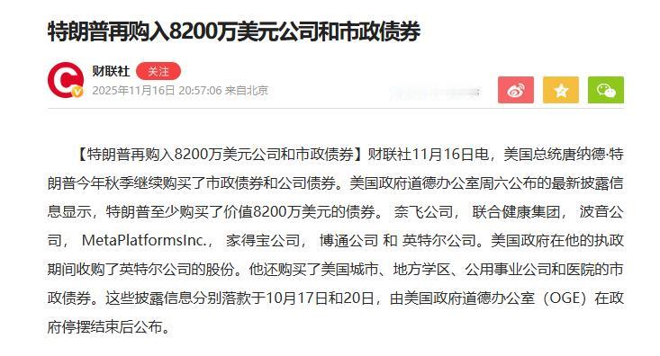 2025年11月16日,美国总统特朗普又被爆出大新闻了,美国政府道德办公室公布的文件显示,他在今年8月底到10月初这一个多月里,至少花了8200万美元狂买公司和市政债券,买的次数超过175次,总价值最高可能超过3.37亿美元。 特朗普的投资版图分得很清楚,一边是覆盖几十个州的市政债券,小到学区建设、医院扩建,大到机场翻新、得克萨斯州天然气项目,全是靠公共资金托底、受政策风向影响极大的领域。这些市政债券背靠地方财政信用,违约风险极低,向来是稳健投资的代名词,显然是冲着稳妥增值去的。 另一边的公司债券更是精准,芯片领域的博通、高通一个不落,科技圈的 Meta、零售行业的家得宝和 CVS 健康也在列,华尔街的高盛、摩根士丹利等巨头更是重仓标的。 更耐人寻味的是,这些投资和他的政策几乎同频共振,政府刚在他推动下收购英特尔股份,他就跟进买入英特尔债券;一直喊着要放松金融监管,手里就重仓了多家银行的债券,这种 “政策铺路、投资跟进” 的节奏很难让人不多想。 其间的小插曲更添话题性,8 月底刚入手摩根大通的债券,11 月 14 日就要求司法部调查这家银行与已故富商爱泼斯坦的旧关联,摩根大通紧急回应 “对过往关联感到遗憾”。 这种先投资后调查的操作,让外界对是否存在利益算计充满疑问。其实这不是他第一次大规模出手,今年 1 月重返白宫后,前 7 个月就买了超 1 亿美元债券,加上这次的 3 亿多,不到一年的债券投资规模相当惊人。 白宫赶紧出来解释,说这些投资都是第三方金融机构打理的,特朗普和家人不参与决策,所有交易都按 1978 年《政府道德法》做了披露,完全合规。 但质疑声压根没停,核心症结就在 “利益冲突” 上。要知道,以往美国总统上任后都会把资产放进 “盲目信托”,彻底切断决策和个人财富的联系,可特朗普没这么做,他的商业收入还是全归自己。 小布什政府前首席道德律师理查德・佩因特直接点破关键,9 月美联储刚开启降息周期,10 年期美债收益率已经跌到 4.05%,债券价格跟着走高。 要是美联储按特朗普的要求继续降息,他手里的债券价值肯定还会涨,这很难不让人怀疑政策取向是否藏着私心。瑞士宝盛固定收益部门负责人达里欧・梅西也提到,降息周期下高评级债券涨幅会更明显,而特朗普持仓全是这类资产。 不过市场上也有不同声音,有分析师认为这只是多元化投资策略。特朗普是美国史上最富有的总统,净资产高达 75 亿美元,之前靠房地产和加密货币赚得盆满钵满,现在重仓高评级债券,或许是为了平衡风险。从交易风格看,他只买不卖,标的全是优质资产,确实符合稳健配置的逻辑。 但普通民众更关心 “公平性”,总统手握政策制定权,却投资那些能从自己政策中受益的行业,即便第三方打理,也很难完全撇清关联。更关键的是,披露文件只给了金额区间,没有精确数字,透明度不足让监督成了难题。 目前美国证券交易委员会和司法部都没表态,但这场 “债券狂潮” 已经把 “政治与财富的边界” 推上风口,后续不管是调查结果还是投资动作,都少不了持续关注。 信源:财联社