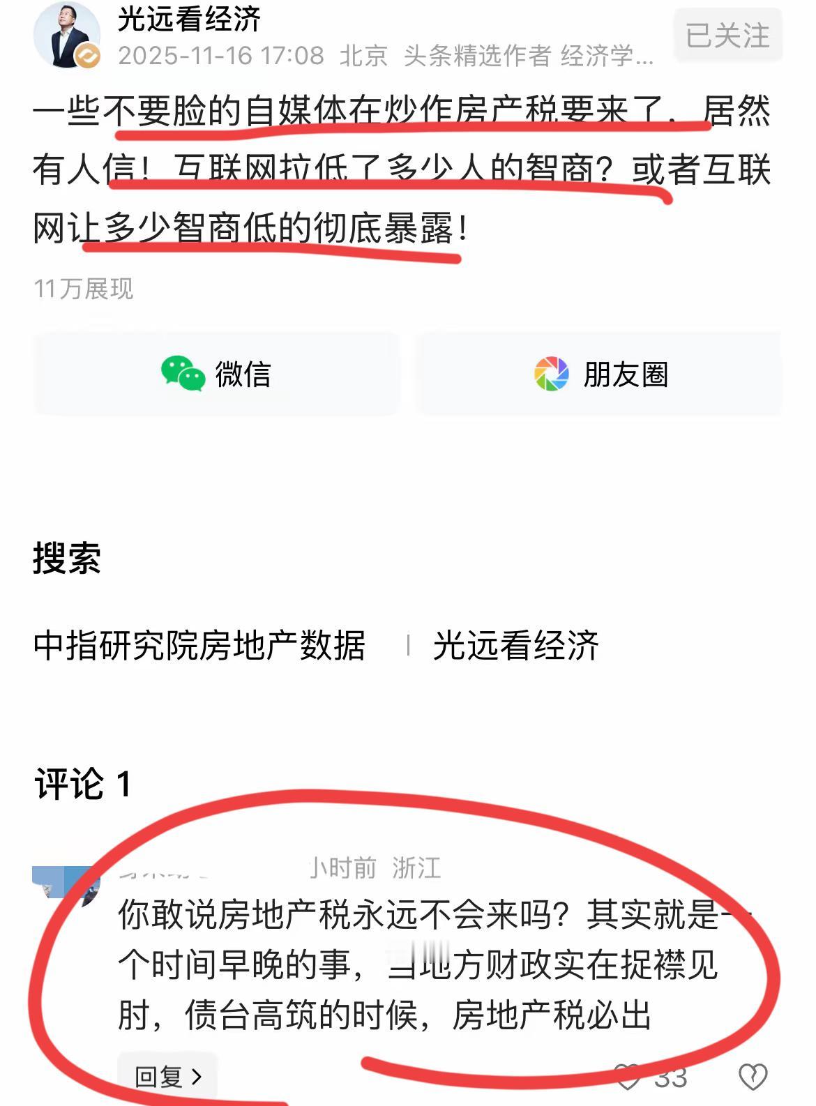 网传房产税要来了?房地产专家马老师直接破防,大骂网友! 这条消息,让著名经济学家,房地产专家马老师大怒! 马老师作为研究房地产几十年的著名专家。 他出来正本清源了。 马光远老师表示,这都是一帮自媒体在炒作房地产税; 这帮人,太不要face了,他都看不下去了。 马老师还说,互联网已经拉低了人们的智商。 而互联网又让多少低智商的人,暴露在阳光之下。 看起来,这次网传的要开征房产税,已经让马老师彻底破防了。 这么说来,专家其实不不支持房产税。 他们普遍认为时机不成熟,需要等到房地产彻底稳住和回升时再征收。 但都到这个时候了,不征收,要等到哪一年呢? 存量足够大,现在经济形势也很严峻。 征收,可以解决财税问题啊。 也有人说,就是怎么收的问题,基准税率是多少? 这才是重点,清其他都好说。 对于要开征房产税,你支持吗,有何高见?