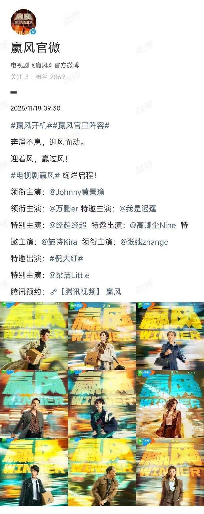 赢风今日开机官宣全阵容,又是一堆花里胡哨的title,不过黄景瑜领衔主演是稳稳一番回车,搭档万鹏,大概讲的是底层创业者成为快递业领军人物,感觉很适合黄老板