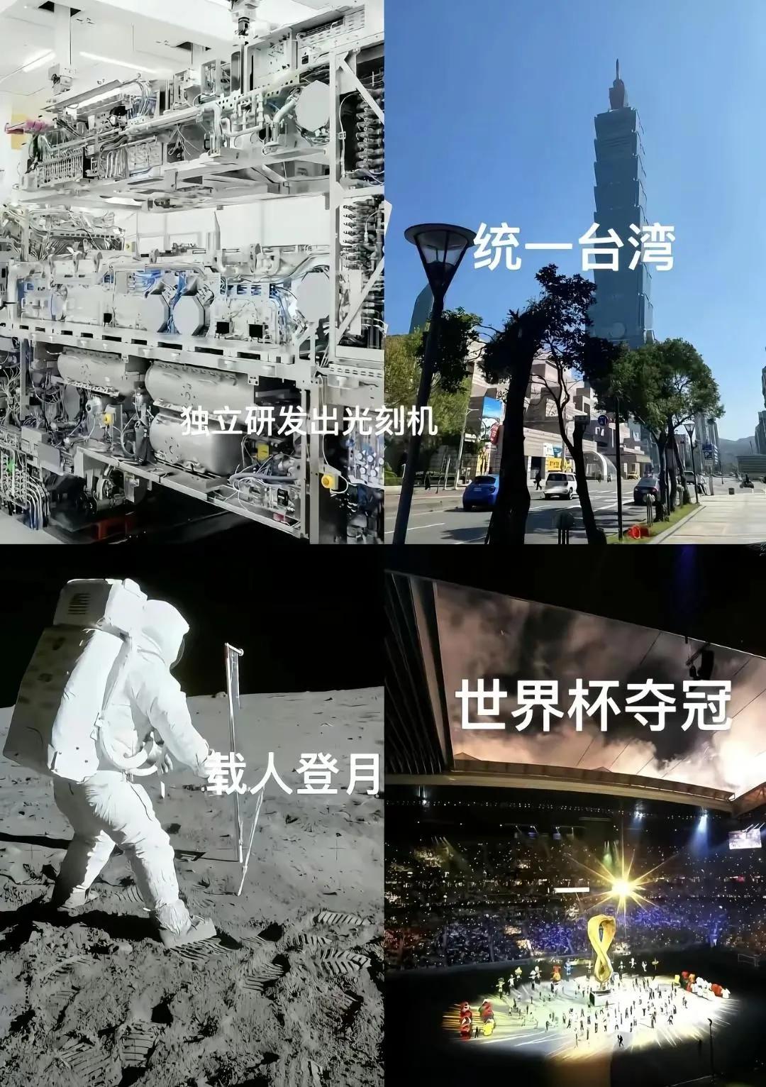 这题我会,容易啊! 看到网友发的这四个选项,问的是你觉得最难的是哪个?如果说选择四个问题中最简单的一个,那是真不好选择,选择最难的一个,这题就太好答了! 统一台湾是一定会实现的! 载人登月是很快就会实现的! 独立研发出光刻机,时间早晚的事情! 至于世界杯夺冠,这个要求对咱们来说是不是有点高了?咱们还是先讨论下实现星际航行的问题吧。[捂脸]