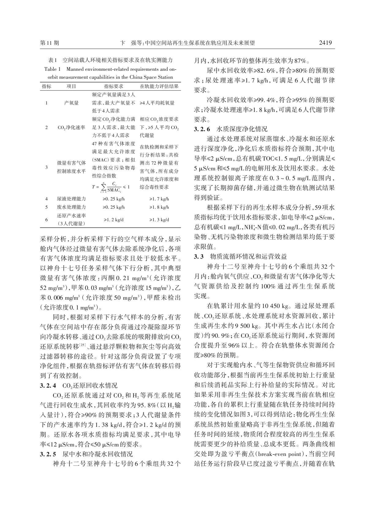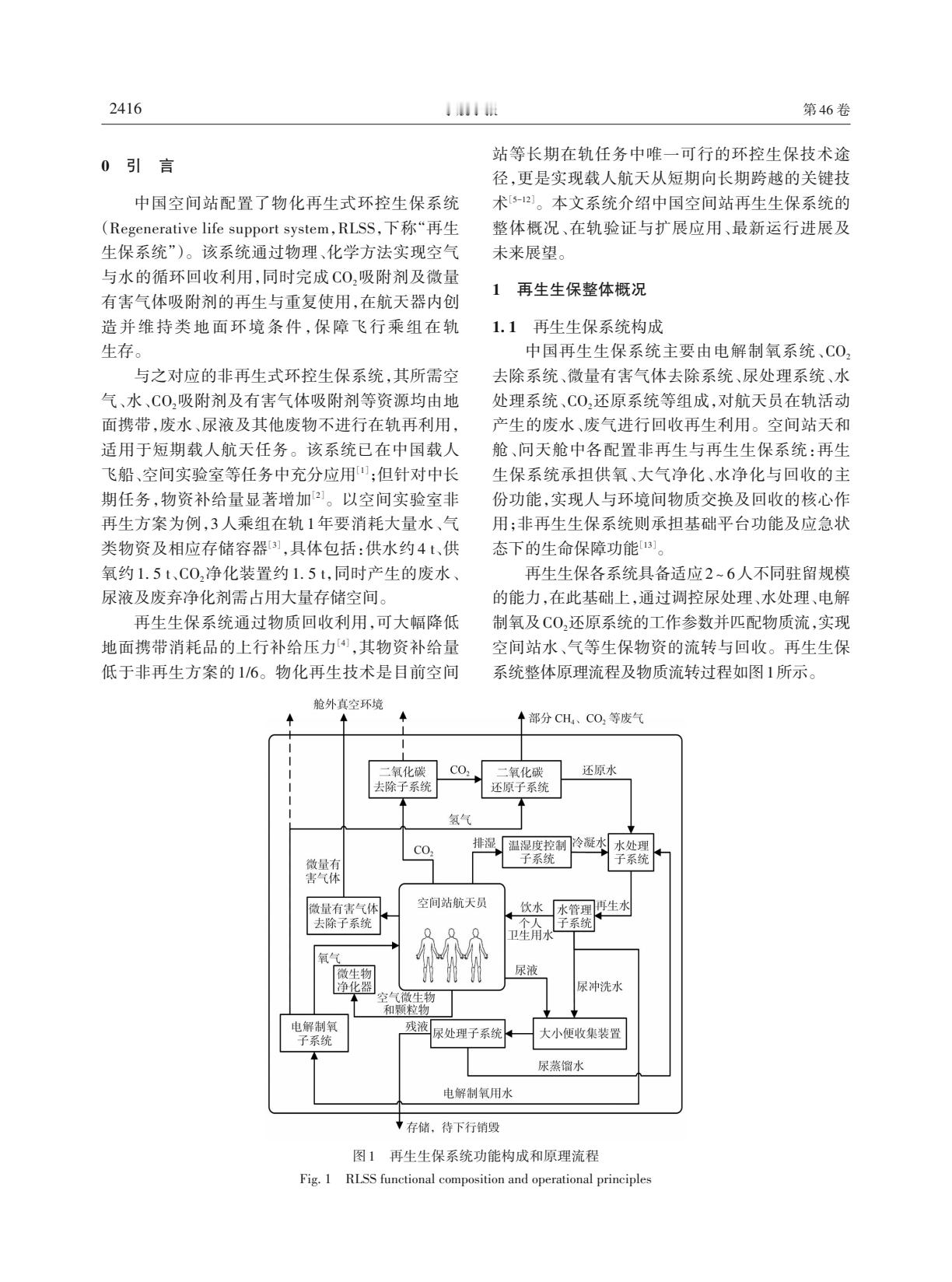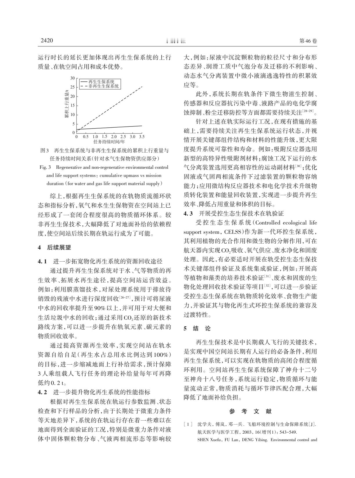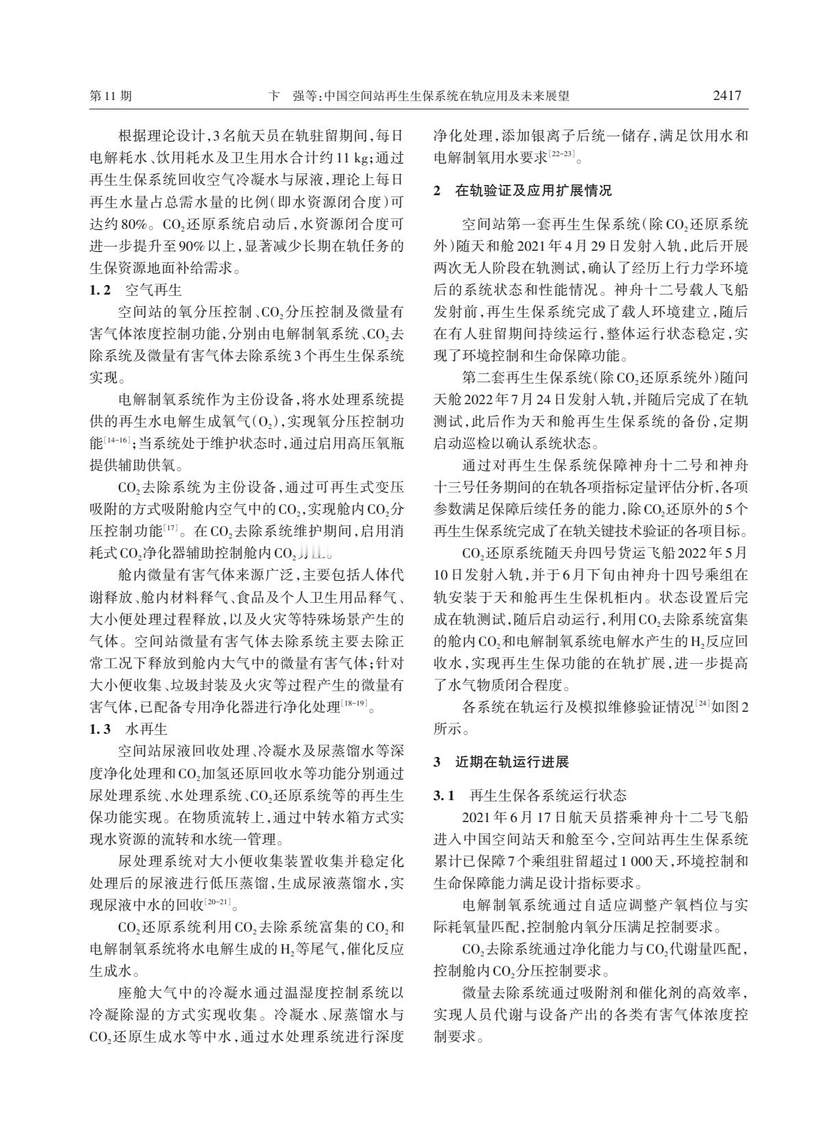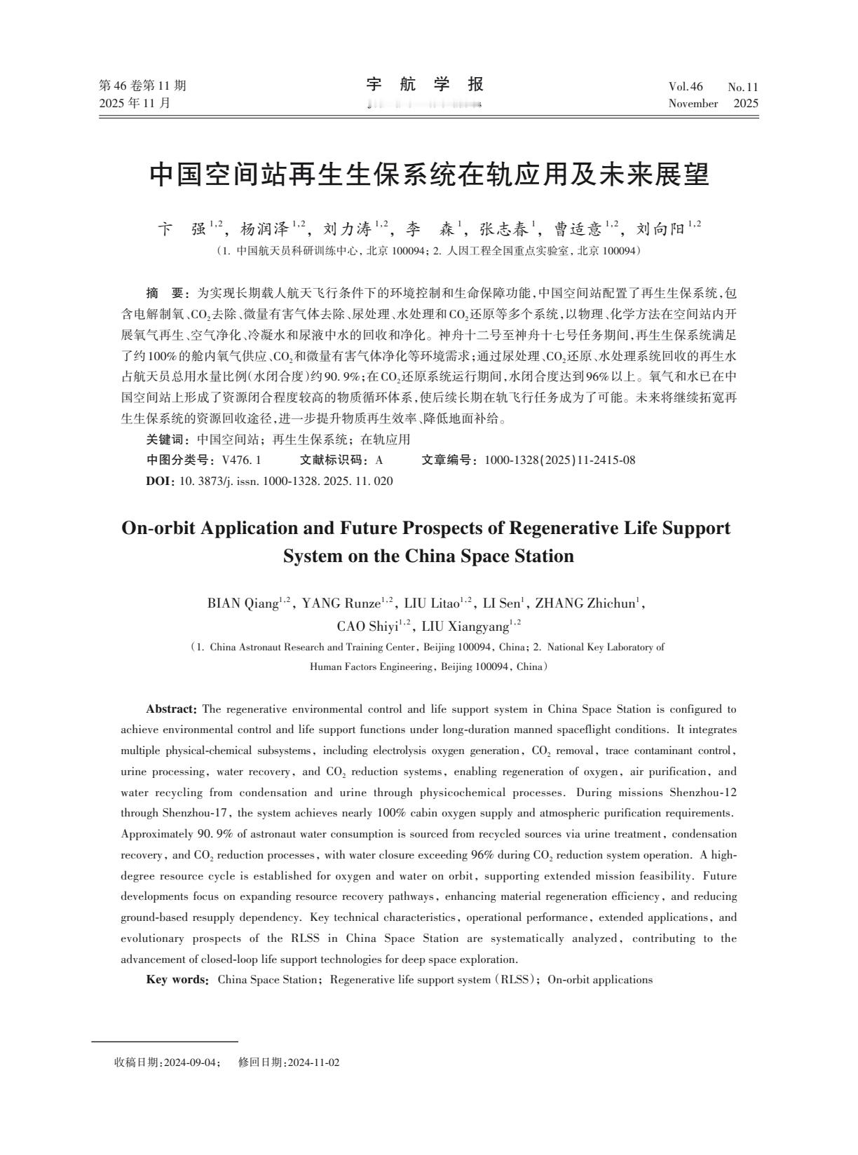 【中国空间站再生生保系统在轨应用及未来展望】中国再生生保系统主要由电解制氧系统,CO去除系统、微量有害气体去除系统、尿处理系统、水处理系统 CO,还原系统等组成,对航天员在轨活动产生的废水、废气进行回收再生利用。2021年6月17日航天员搭乘神舟十二号飞船进入中国空间站天和舱至今,空间站再生生保系统累计已保障7个乘组驻留超过1000天,环境控制和生命保障能力满足设计指标要求。通过提高资源再生效率,实现空间站在轨水资源自给自足(再生水占总用水比例达到100%)的目标,进一步缩减地面上行补给需求,预计保障3人乘组载人飞行任务的理论补给量每年可再降低约0.2t。
