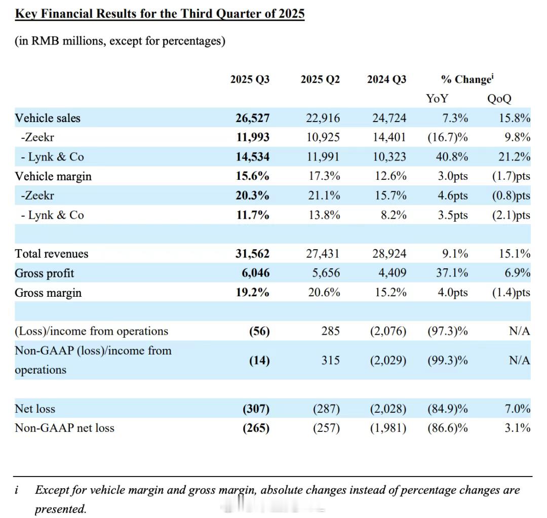 极氪科技 2025 年三季度,也给出一个可以参考的结果,营收 315.6 亿元,同比增长 9%;交付 14 万辆,同比增 12.5%, 净亏损 3.07 亿元,同比收窄 84.9%。交付:14 万辆(140,195 辆车),比去年同期的 12.46 万辆,同比增长 12.5%极氪品牌:52,860 辆领克品牌:87,335 辆领克是增长主力,极氪则保持稳中有升营收来自两部分:汽车销售收入 265.3 亿,同比增长 7.3%,极氪品牌 Q3 收入119.9 亿,领克 Q3 收入 145.3 亿其他销售及服务收入 50.35 亿,同比增长 19.9%毛利 60.46 亿,同比增长 37%;毛利率 19.2%,比去年同期 15.2%,提升非常明显。新车型带来的结构提升,成本优化与规模效应Q3 研发投入27.43 亿,销售及行政费用37.83 亿,用于新车型上市的推广。