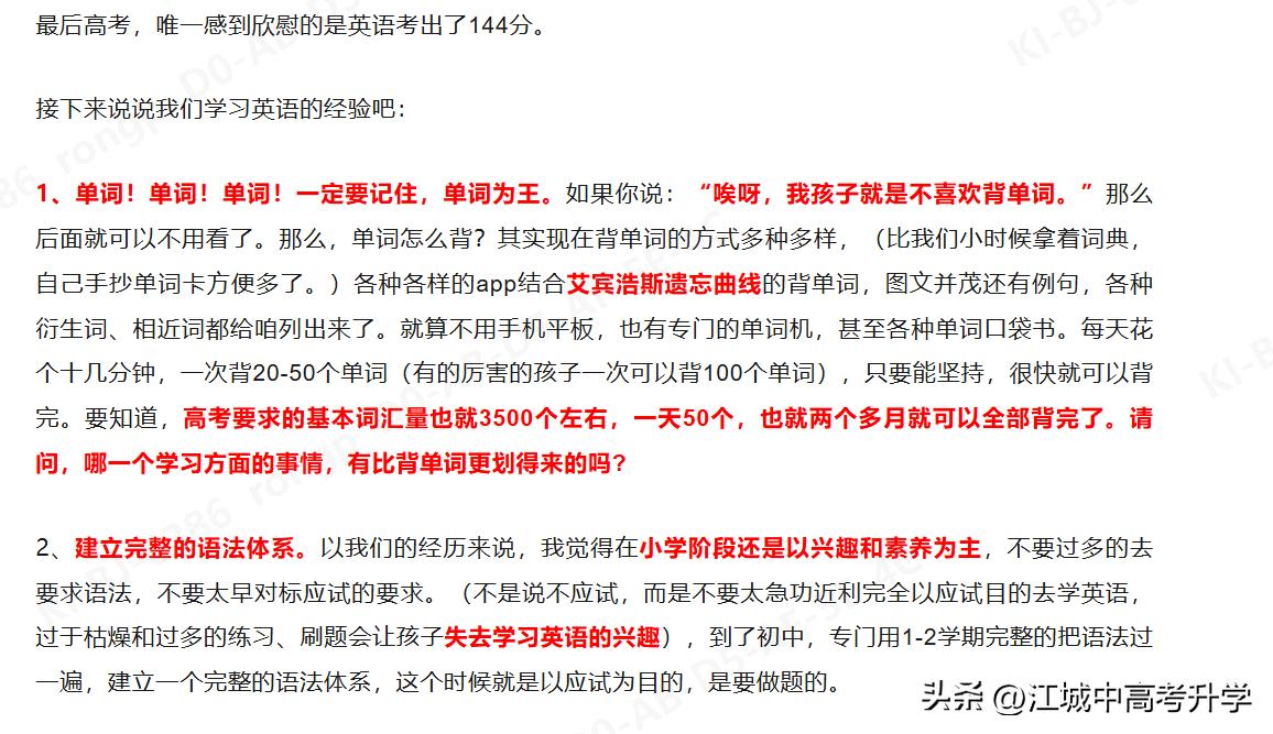 高中提分性价比最高的学科就是英语了 英语其实需要的能力比较单一, 就是单纯的花时间就可以看到产出的学科, 而不像其他的数理化听得懂课, 和做的了题是两回事, 更不像玄学的语文,教考分离, 花了时间学,提不提分也是未知数。 但是英语不同,只要长时间的给英语时间, 在英语上投入足够多的时间, 而且最重要的就是单词, 高中的3500的单词,记一遍不行, 那就记两遍,两遍不行就三遍, 反反复复化整为零分解到每天, 英语单词上去了,成绩自然就会上去。 有的家长就说了,孩子不会自觉记单词, 对,是,没有那么多自觉的孩子, 那可以有自律家长啊,用好高科技的app, 辅助孩子记单词,帮助孩子记单词, 长此以往,总会有收获。
