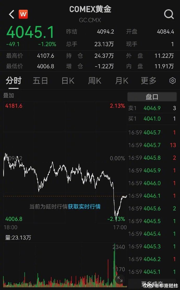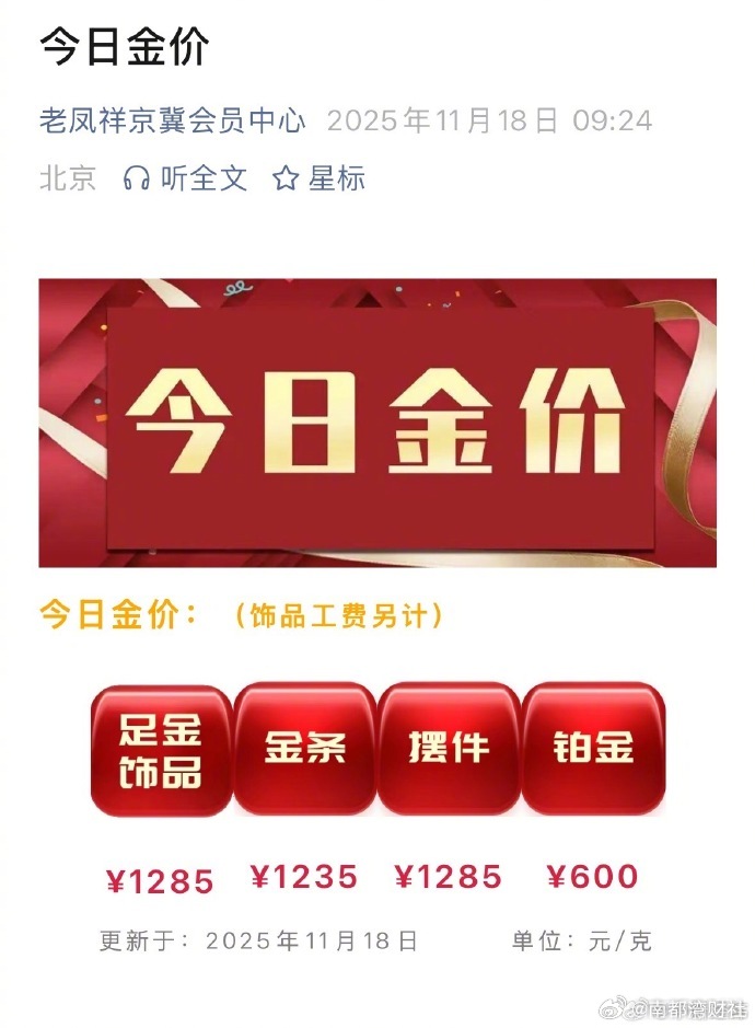 美东时间11月17日,国际金价再度下挫。北京时间11月18日,国际金银价格开盘后跳水。现货黄金盘中一度失守4030美元/盎司;COMEX黄金期货跌近1%。 查询到,国内有品牌金饰价格从14日开始已实现四连跌。其中,周生生足金饰品报1289元/克,较前一日1305元下跌16元/克;老庙黄金足金饰品报1276元/克,较前一日1289元/克下跌13元/克,较13日高点已实现四连跌;老凤祥足金饰品报1285元/克,较前一日1293元/克下跌8元/克,较13日高点也已四连跌。