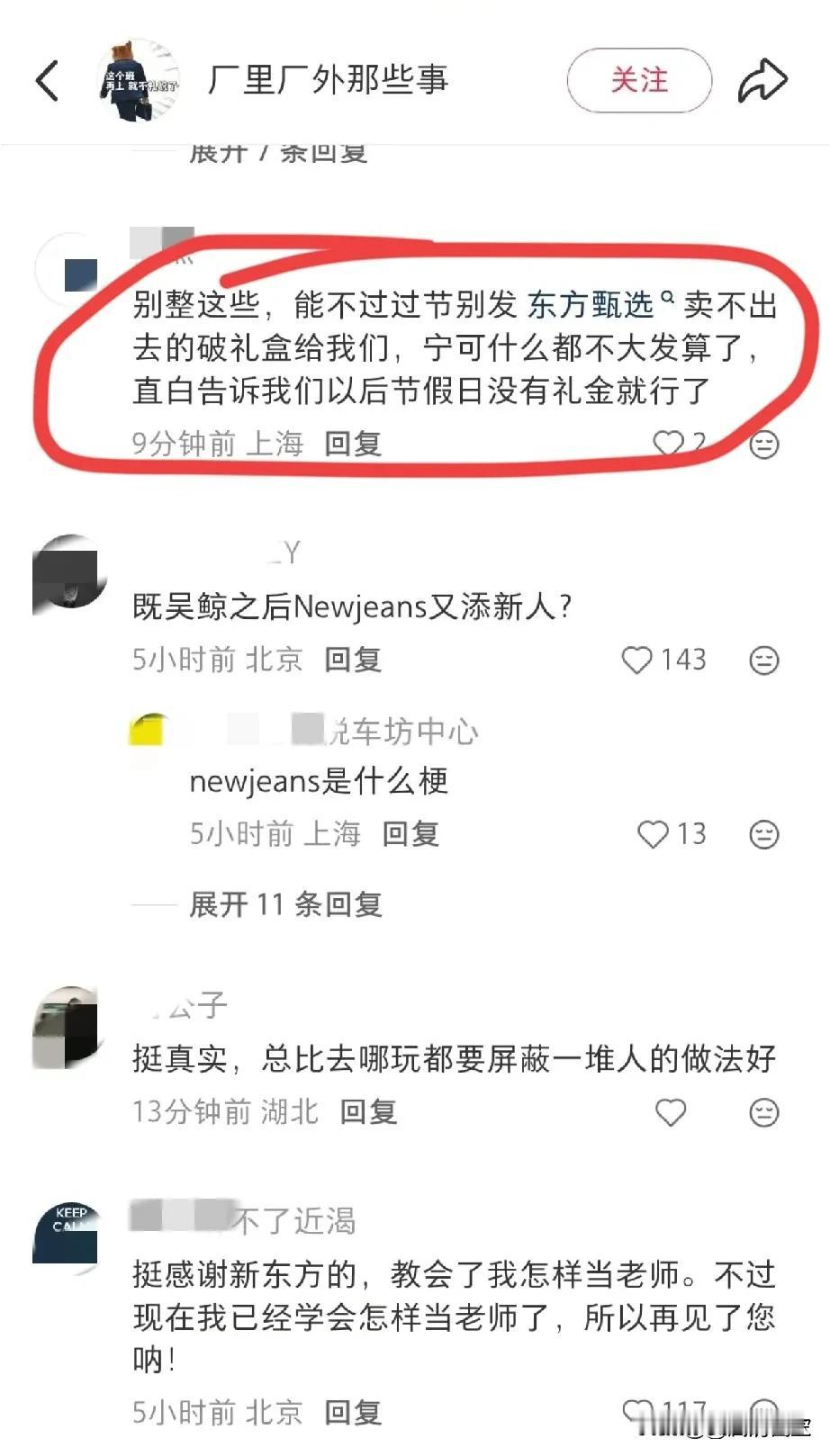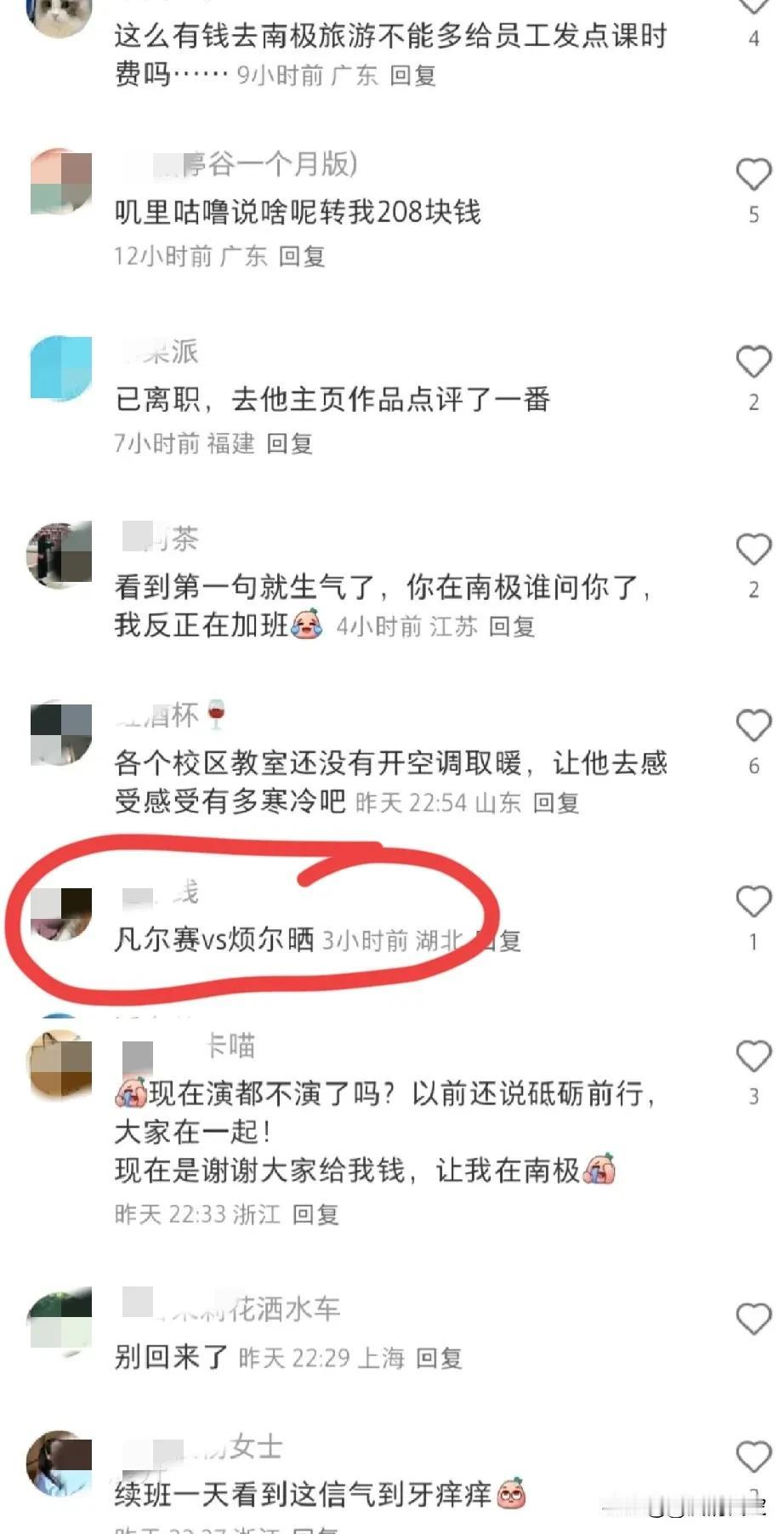 遮羞布疑似被员工扯了。 俞老板在南极又立“功劳”,一封32周年庆的内部告白信,疑遭员工集体吐槽。 因信中5次提及自己在南极,并鼓励员工要“像企鹅一样相互扶持”。 有人说:吃肉的人向吃不上肉的吧唧嘴,吃不上肉的还要继续给他当苦力添肉。 他何止薅员工羊毛啊,连学生都不放过!北京新东方大楼自助机里全是甄选的东西,没其他选择!上课学生都在高层,下楼去买,电梯很慢,根本来不及! 所以,爱一个人有无数个理由,不爱一个人也有无数个理由。时代变化太快,人的心也难以揣测,但不要委屈,只说明你不够足够下沉而是高高在上做不到真心待人。