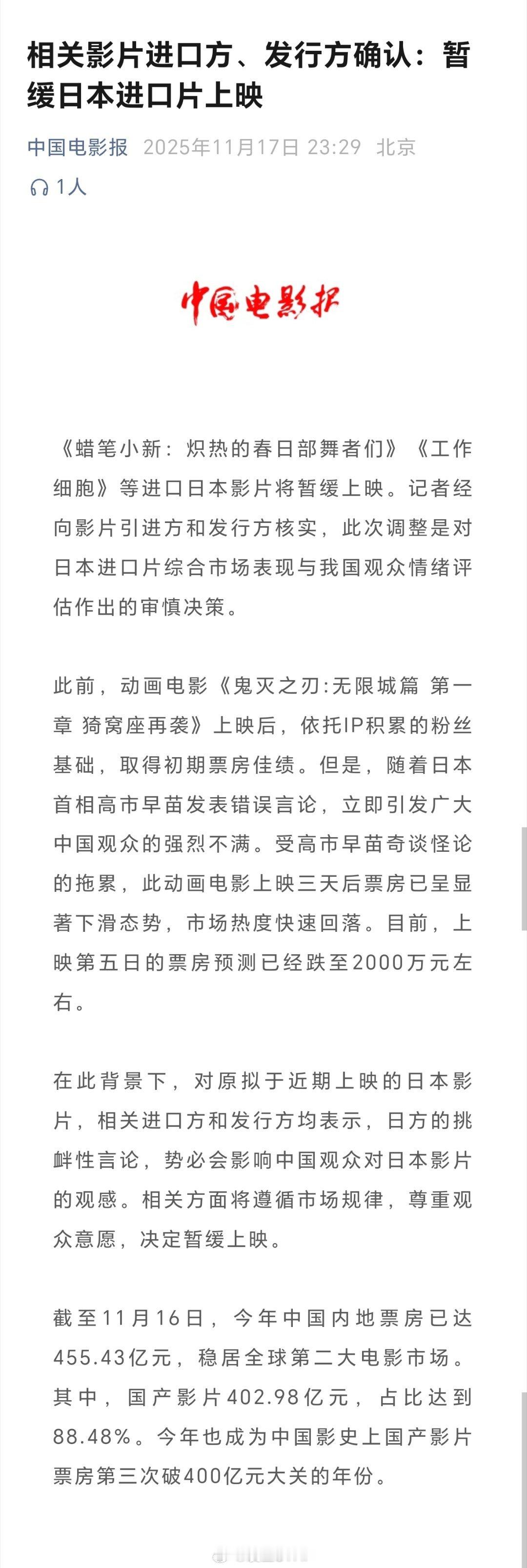 据中国电影报:相关影片进口方、发行方确认:暂缓日本进口片上映