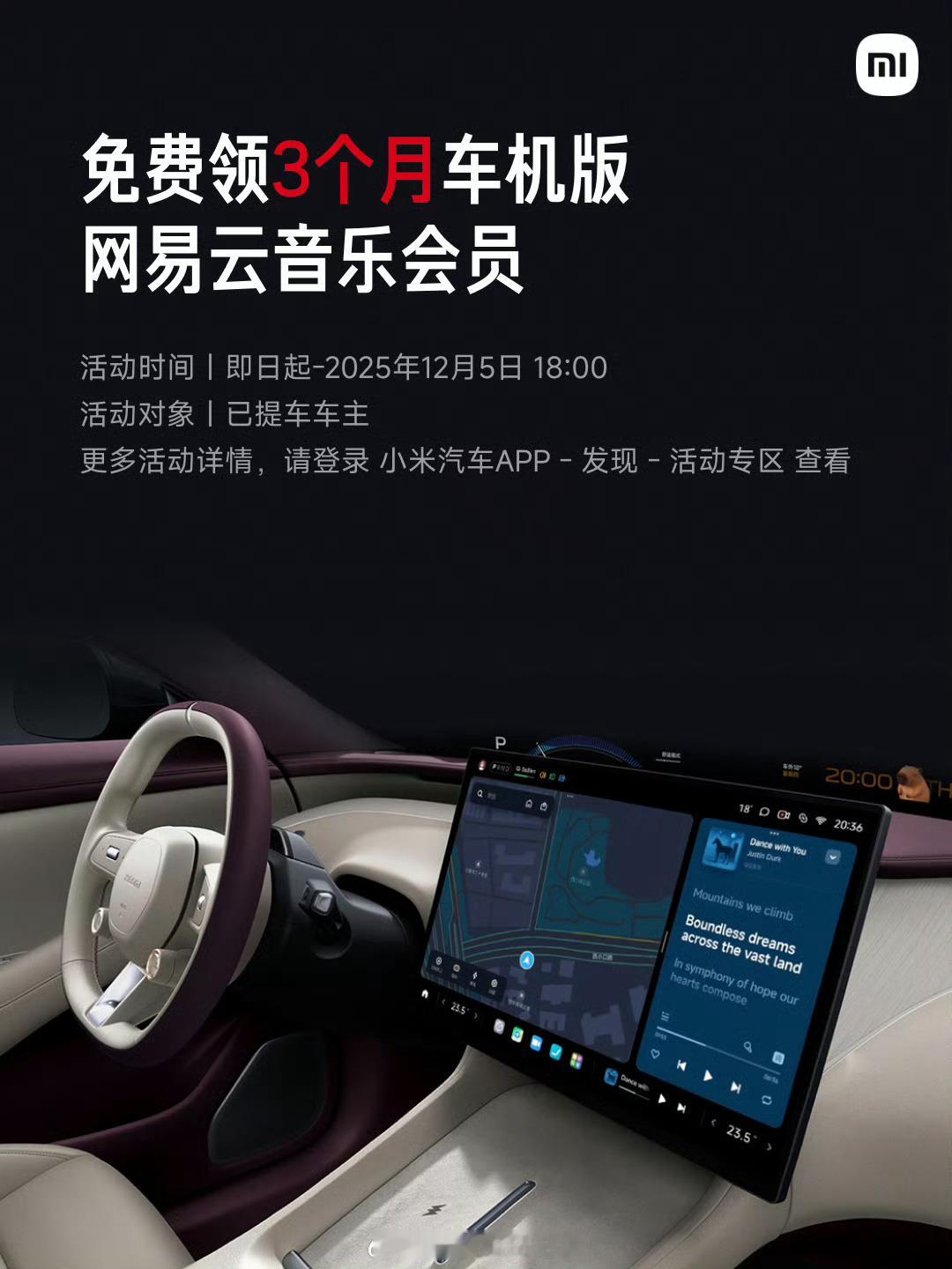 又送网易云音乐会员?!小米汽车APP登陆网易云音乐(车机版)扫码可以领三个月VI