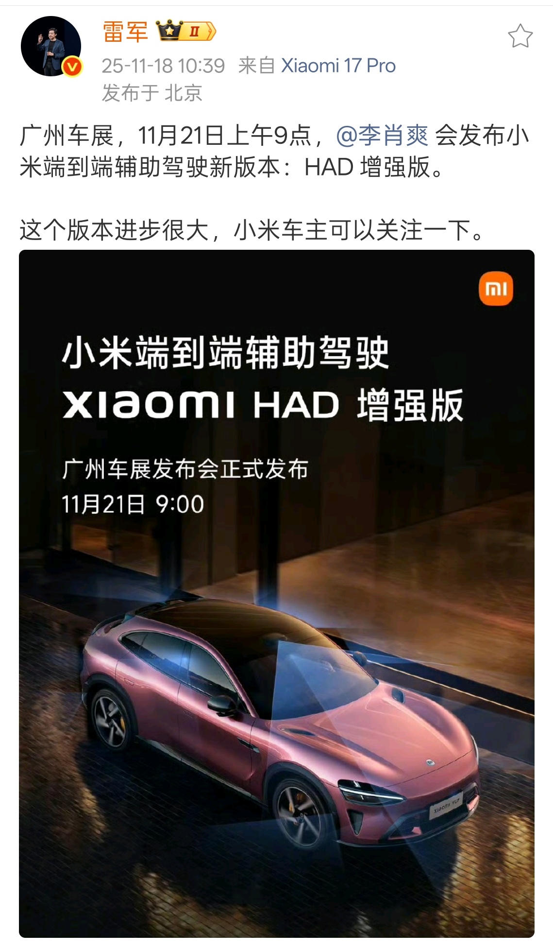 小米 HAD 增强版要上了,明确不是 VLA。我猜测是端到端+强化学习的版本,据说效果很好