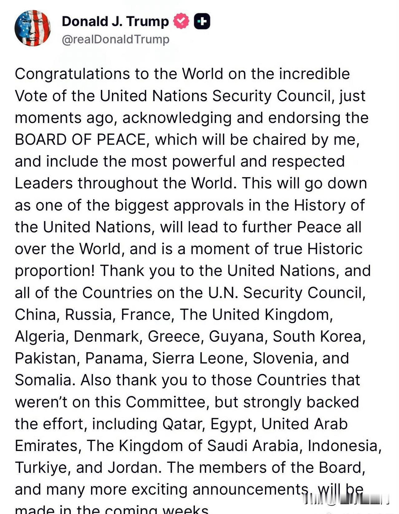 联合国安理会成立和平委员会,川普总统刚刚发文: “祝贺全世界!就在刚刚,联合国安理会以令人难以置信的投票结果,正式承认并支持“和平委员会”(Board of Peace)的成立,并将由我担任主席,成员将包括全球最具影响力、最受尊敬的领导人。这将成为联合国历史上最重大的批准之一,将为全球带来更多和平,也是一个真正具有历史意义的时刻! 感谢联合国以及安理会所有国家:中国、俄罗斯、法国、英国、阿尔及利亚、丹麦、希腊、圭亚那、韩国、巴基斯坦、巴拿马、塞拉利昂、斯洛文尼亚和索马里。同时也感谢那些虽未在本委员会内、但强力支持此项努力的国家,包括卡塔尔、埃及、阿联酋、沙特阿拉伯王国、印度尼西亚、土耳其和约旦。 委员会成员及更多令人振奋的宣布,将在未来几周公布。”