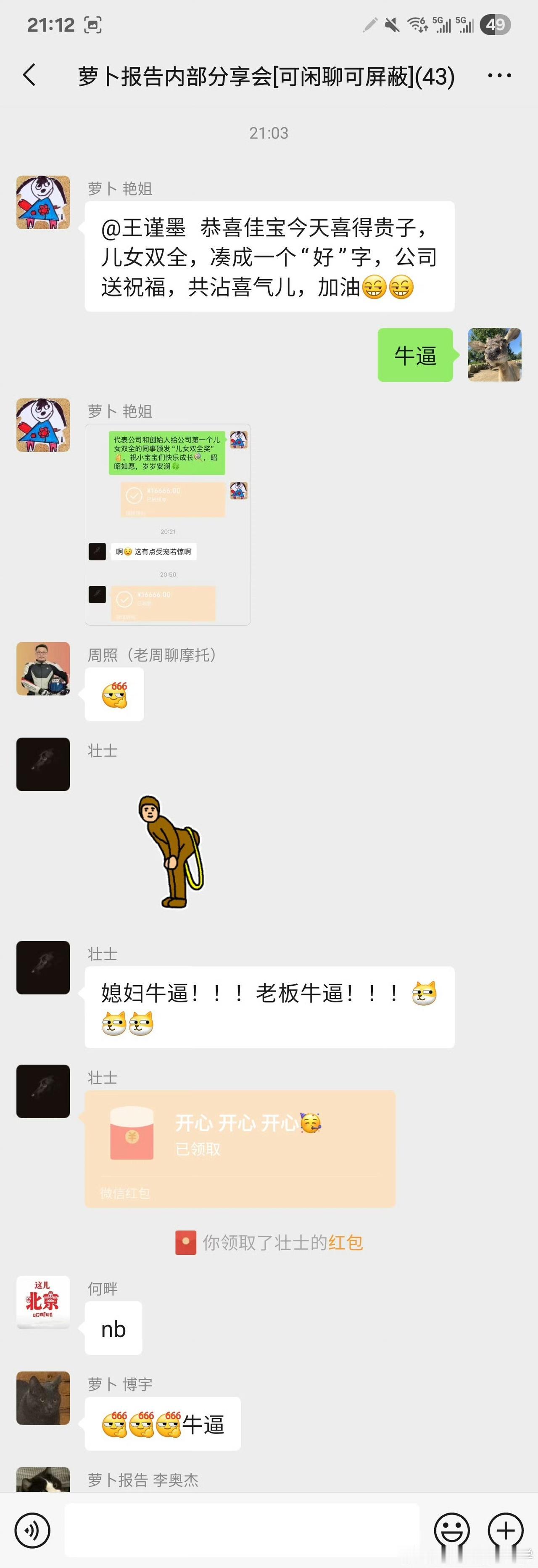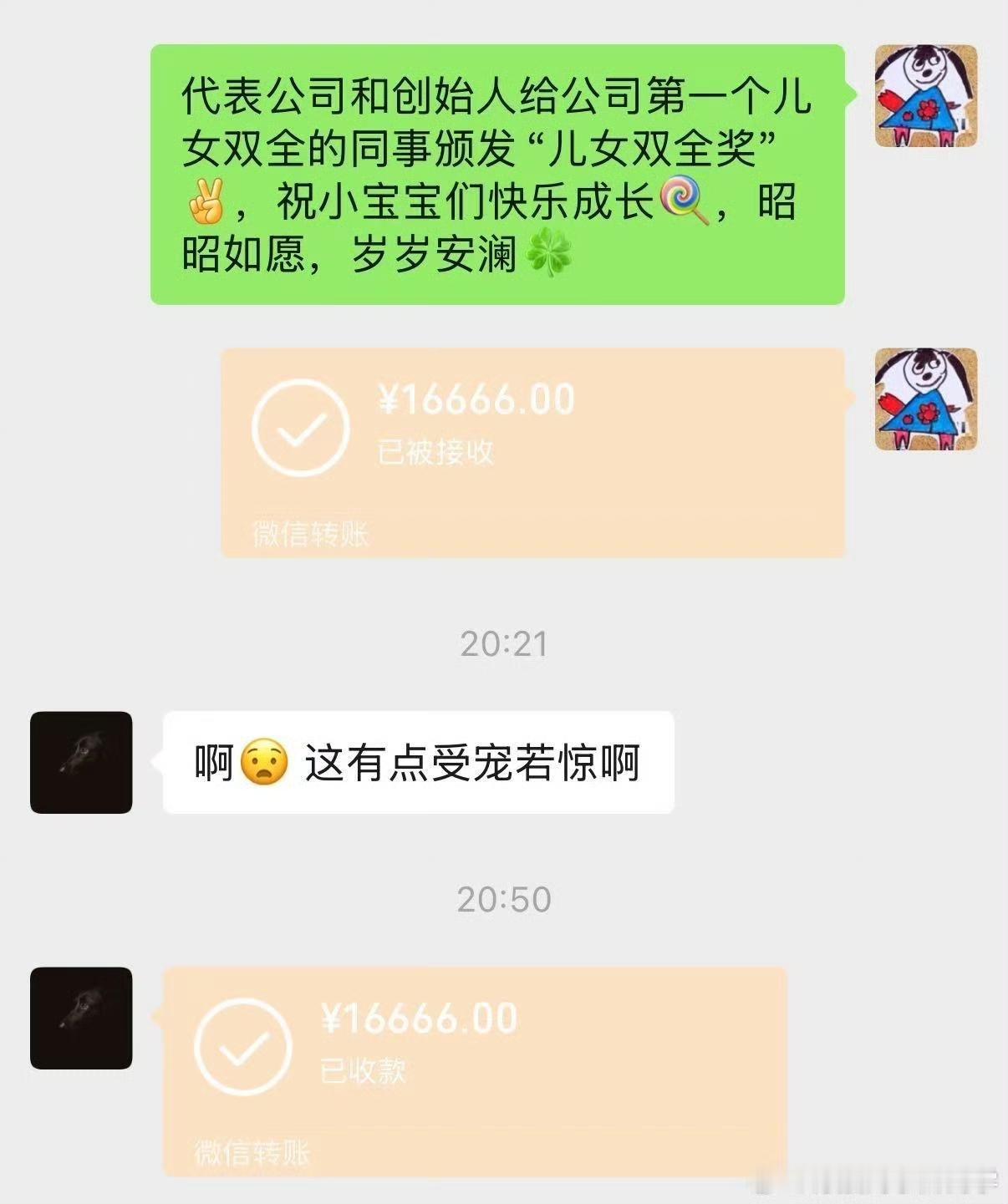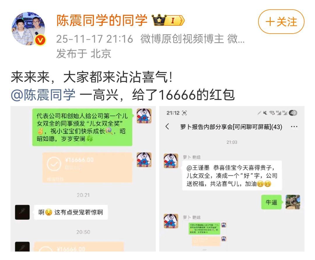 陈震同学的同学:来来来,大家都来沾沾喜气!@陈震同学 一高兴,给了16666的红包 ! 原因是公司有同事“儿女双全”,借此名义发了一个“儿女双全奖”,红包的金额也相当的大,给了16,666元红包。 这样的公司工作真是开心的要死,发的红包也相当的给力。各位是怎么看的?欢迎评论区留言。