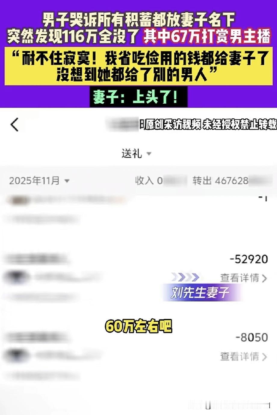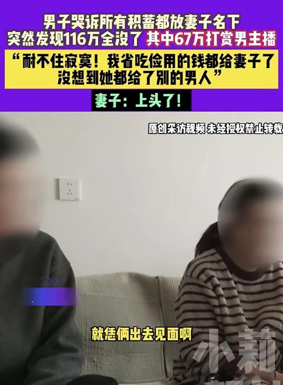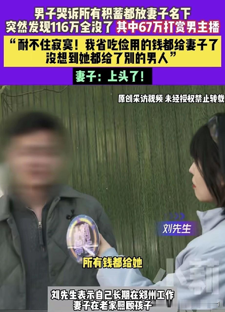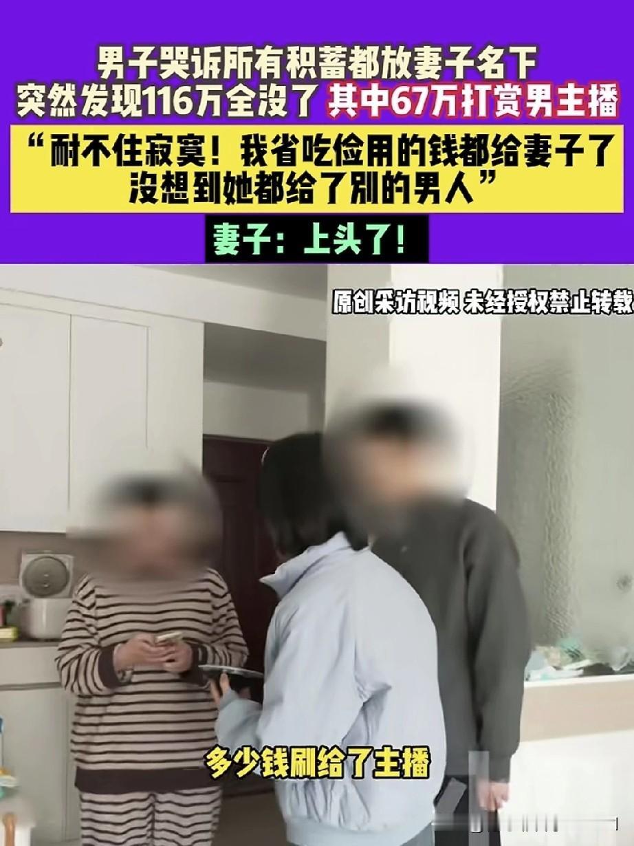 男子面对记者哭诉,自己所有的存款都存在媳妇名下,突然发现116万存款全没了。其中67万被媳妇打赏给男主播,剩余的钱财,媳妇支支吾吾说不清楚。再三逼问下还到欠别人8万。 这种情况,分明是日子过得太安逸,耐不住寂寞、经不住诱惑、寻求刺激的典型表现,也是很多人犯错的根本原因。这老婆看着挺让人有安全感的,遇到这么好的老公却不懂得珍惜,还拿钱去捧外面的男人,殊不知自己老公挣钱有多辛苦,真是生在福中不知福! 作为女性,我认为家里谁有能力,财产权就交给谁管理。有些女人常年在家不上班,根本体会不到男人在外赚钱的艰辛,花钱毫无节制,也不懂得心疼。 钱可能追不回来了,毕竟妻子是成年人,钱刷出去的那一刻,就注定回不来了。我不同情这种男人,太笨了!赚钱养家是应该的,但财政大权得自己把控,不然一无所有、净身出户就是你的结局。男子能有100多万存款,说明你有理财能力,而你妻子没挣过钱,也就证明她没有理财能力,怎么能把全家资金交给她保管呢?只能怪你自己,别责怪妻子,还是得从自身找原因吧!