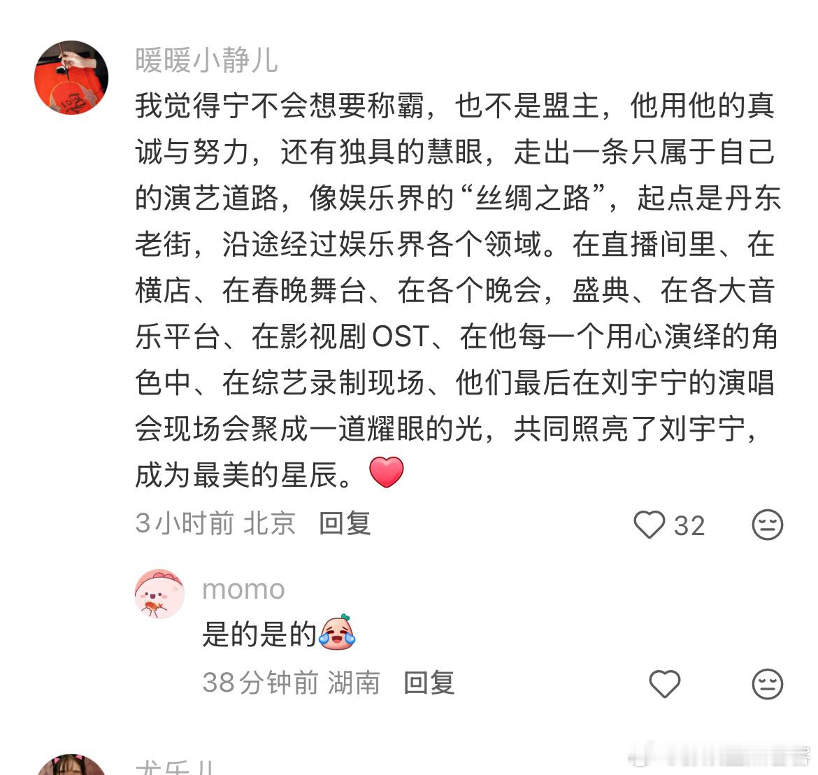 这个回答看哭了刘宇宁用他的真诚与努力,还有独具的慧眼走出一条只属于自己的演艺道路像娱乐界的“丝绸之路”起点是丹东老街,沿途经过娱乐界各个领域。在直播间里、在横店、在春晚舞台、在各个晚会,盛典、在各大音乐平台、在影视剧OST、在他每一个用心演绎的角色中、在综艺录制现场、他们最后在刘宇宁的演唱会现场会聚成一道耀眼的光,共同照亮了刘宇宁,成为最美的星辰。👏