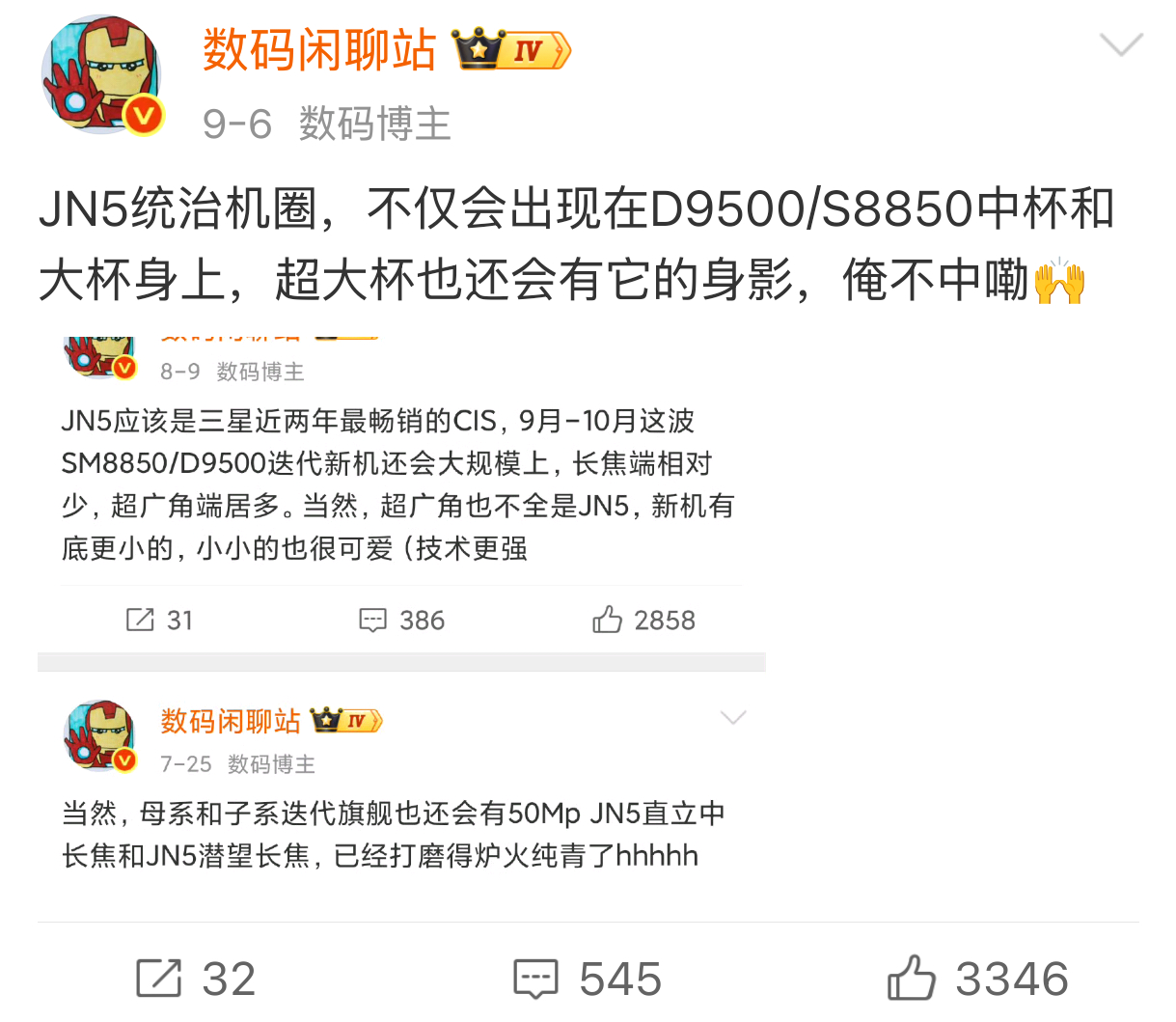 9月不就说过了,JN5接着统治机圈,不止一台骁龙8E5超大杯会用JN5副摄,某些超大杯也会有类似JN5的小底副摄,影像升级点在主摄和潜望Tips: X300U除外,它是三颗都升级,甚至……