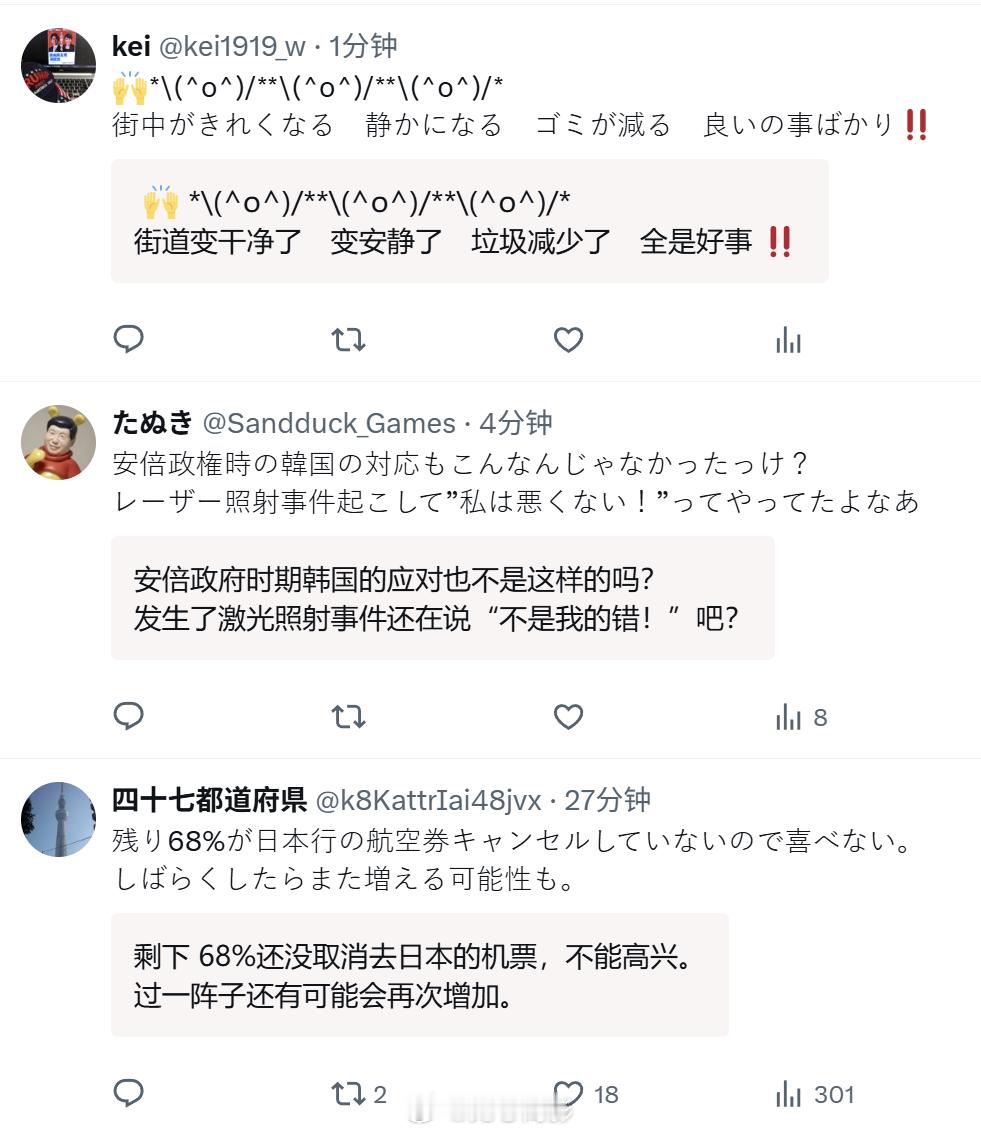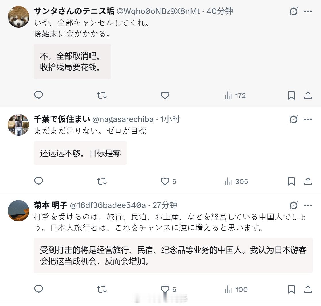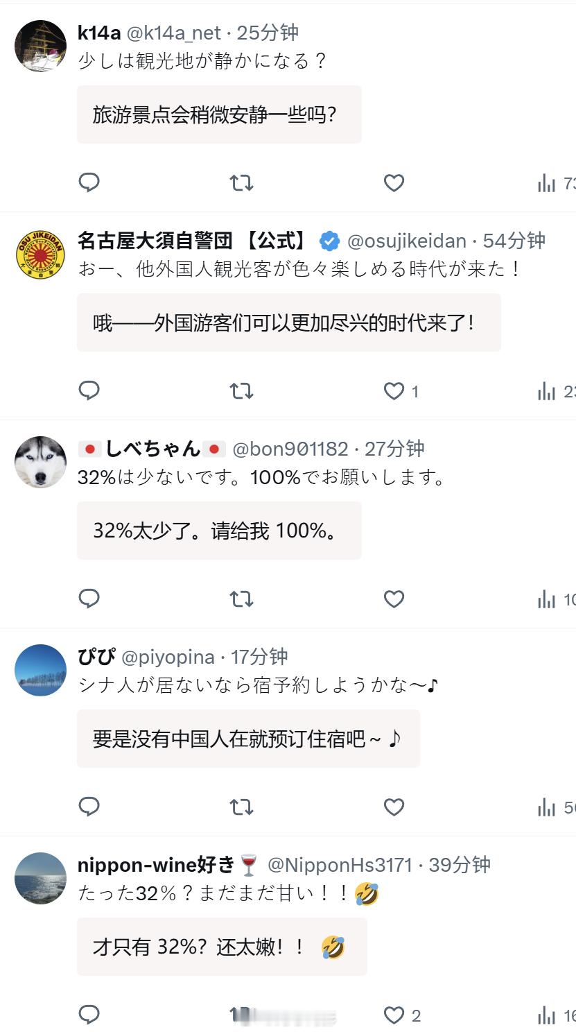 日本右翼在庆祝,有新闻报道称,自周六以来,中国航空公司记录了大约 49.1万张飞往日本的机票被取消。约占其前往这一热门目的地预订总量的 32%。评论区的日本网民兴高采烈,大肆庆祝,认为中国游客占比很小,而且受损的也是在日本的中国人的旅行社,觉得“日本终于要干净了”。嗯,记录一下。