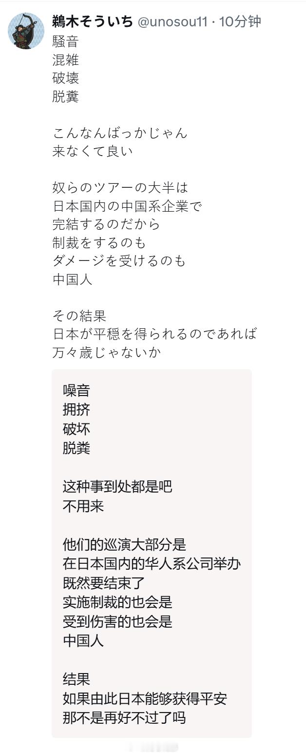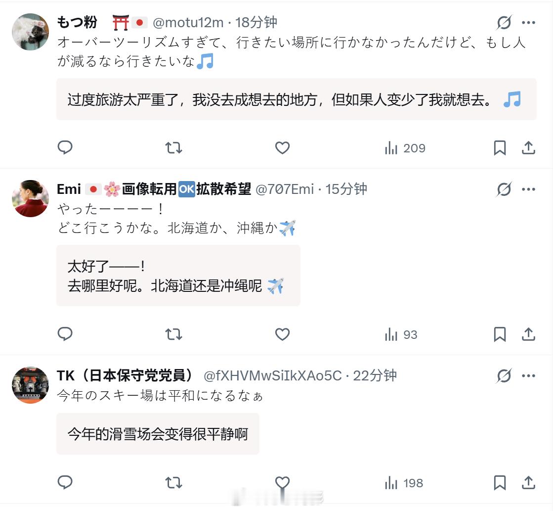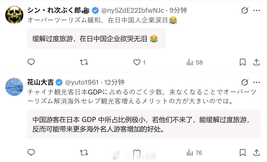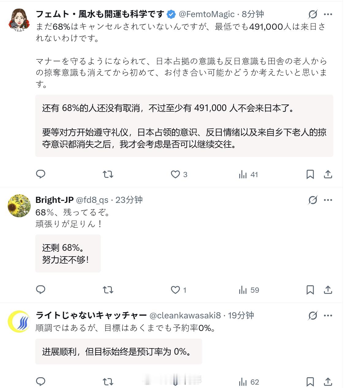日本右翼在庆祝,有新闻报道称,自周六以来,中国航空公司记录了大约 49.1万张飞往日本的机票被取消。约占其前往这一热门目的地预订总量的 32%。评论区的日本网民兴高采烈,大肆庆祝,认为中国游客占比很小,而且受损的也是在日本的中国人的旅行社,觉得“日本终于要干净了”。嗯,记录一下。
