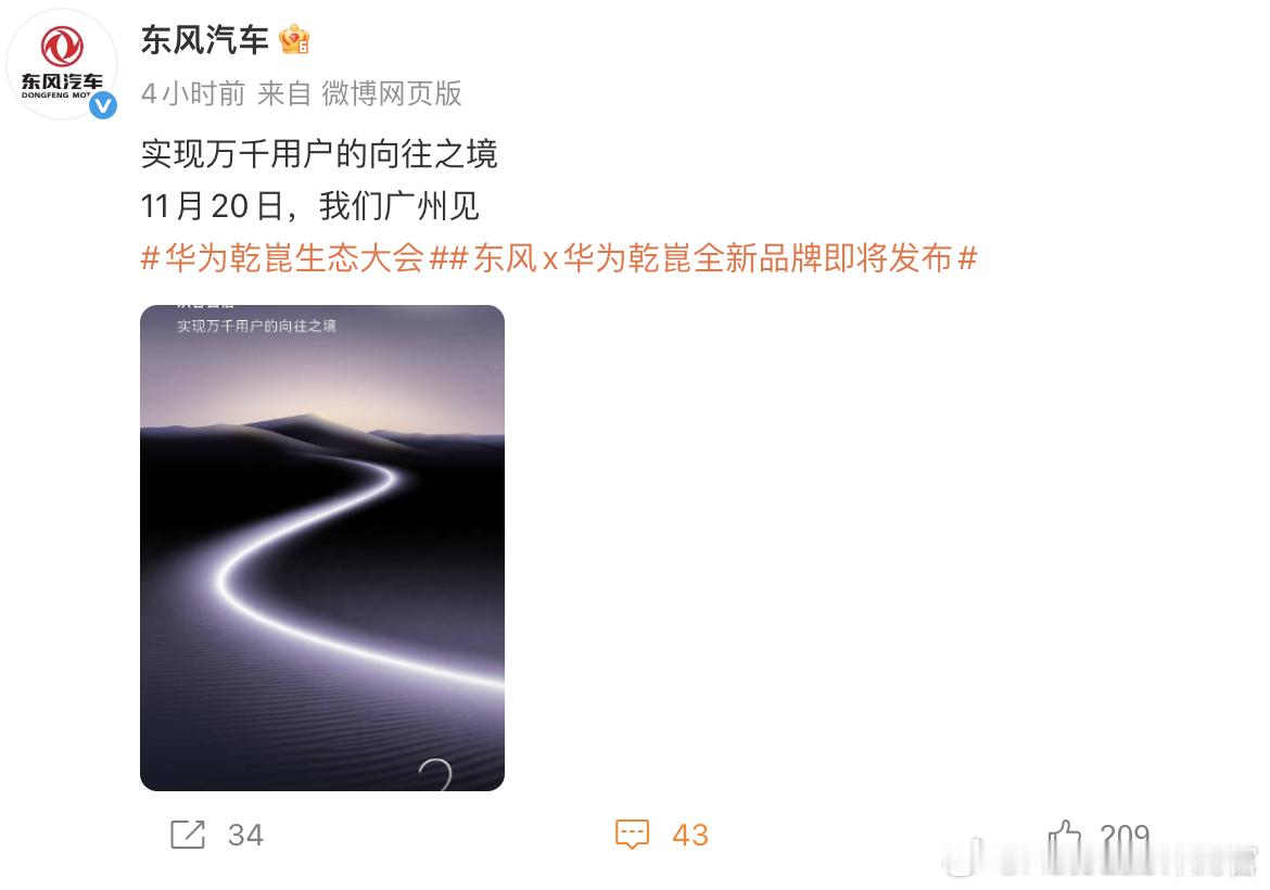 说真的,华为现在真有“境界”。继鸿蒙五界之后,华为的“境”也挨个上了。华为跟广汽合作了启境、跟宝骏合作了华境,跟东风合作的“境”今天也官宣了到11月20日举办发布会。值得注意的是,鸿蒙五界由余承东主导,“境”系列由徐直军主导。鸿蒙五界主打高端化,“境”系列目前看起来更关注20万以下市场。新能源汽车市场看起来真是到处都有华为的影子了。大家看好华为的这些境吗?