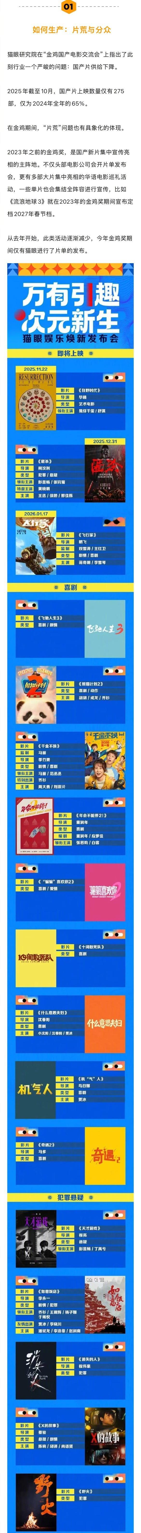 2025年截至10月,国产片上映数量仅有275部,仅为2024年全年的65%。金鸡期间,“片荒”问题也有具象化的体现。2023年之前的金鸡奖,是国产新片集中宣传亮相的主阵地。但从去年开始,此类活动逐渐减少……↓