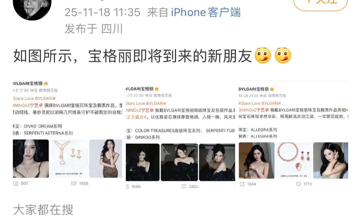 赵露思的宝格丽是不是掉了?宁艺卓接上了宝格丽合作哎宁艺卓还蛮适合宝格丽的,也比她带货。