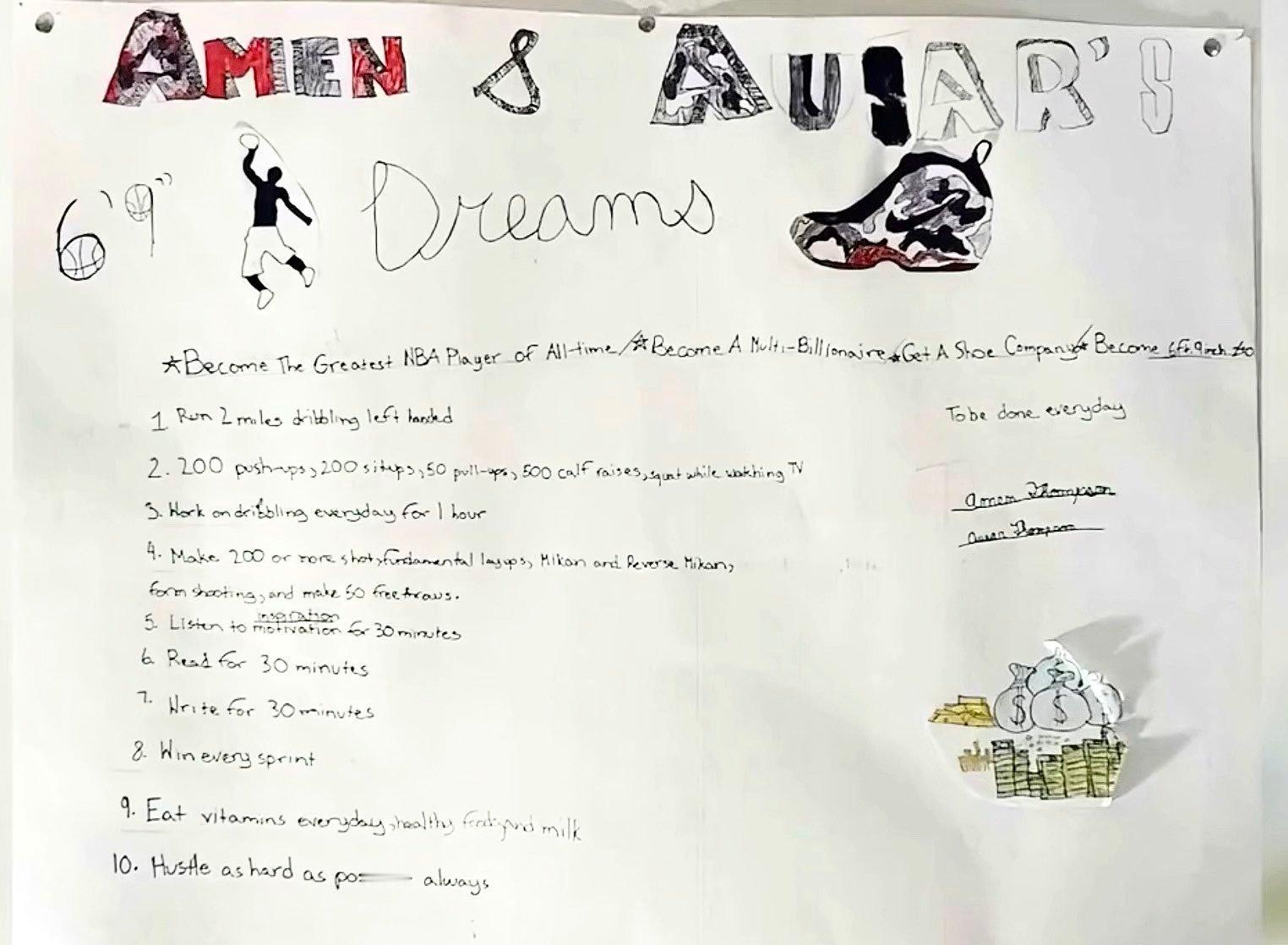 阿门·汤普森昨天上脚的战靴的首秀堪称完美轮回——全新GT Cut PE配色的设计灵感,源自兄弟俩童年写下的《阿门与奥萨尔梦想清单》中的“战斗机”泡喷球鞋。这份梦想清单是汤普森兄弟在九岁那年亲手写下的。