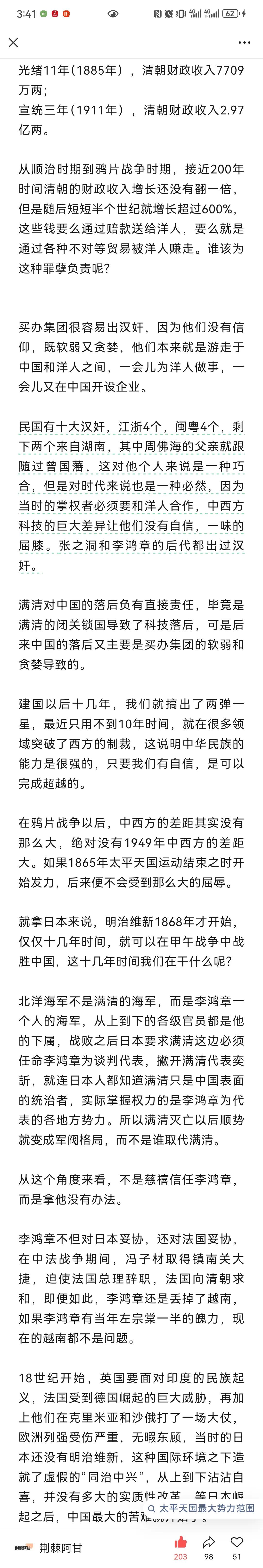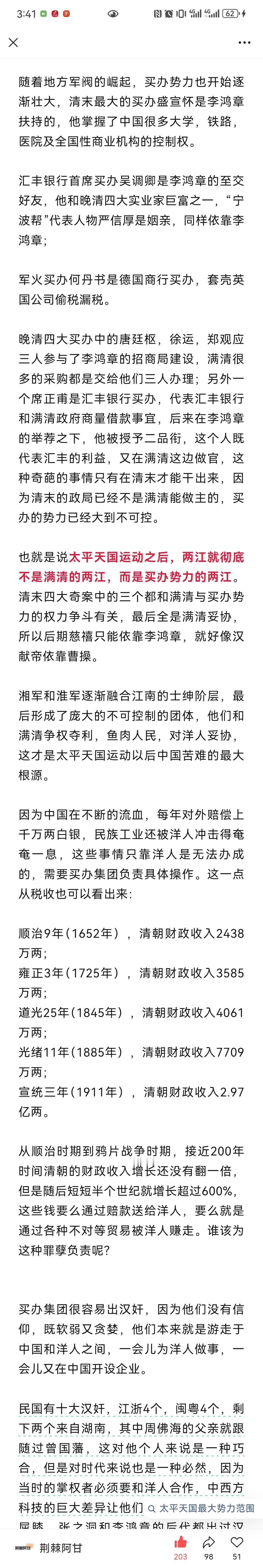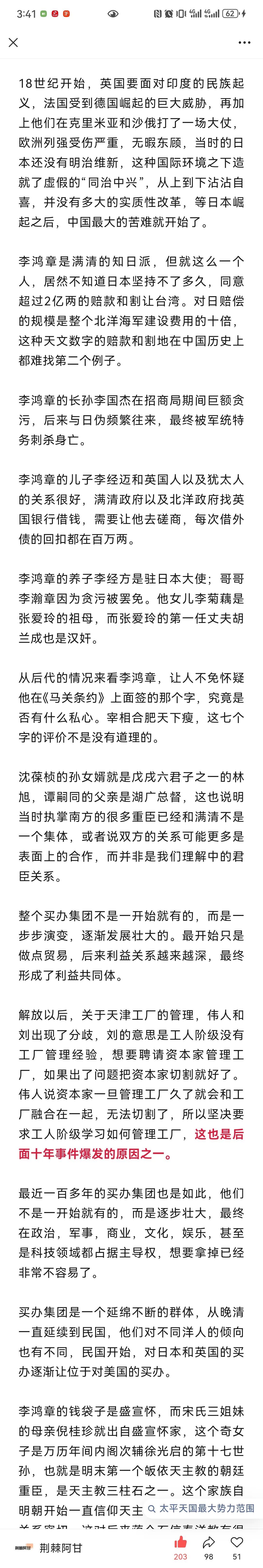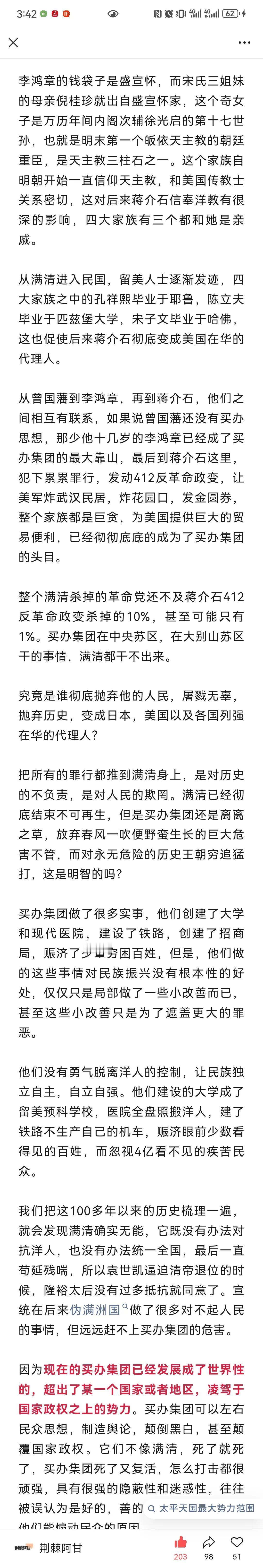 荆棘阿甘:买办集团一直都存在于我们身边,纵观历史究竟是谁彻底抛弃他的人民,屠戮无辜,抛弃历史,变成日本,美国以及各国列强在华的代理人? 其实把所有的罪行都推到满清身上,是对历史的不负责,是对人民的欺罔。满清已经彻底结束不可再生,但是买办集团还是离离之草,放弃春风一吹便野蛮生长的巨大危害不管,而对永无危险的历史王朝穷追猛打,这是明智的吗?这是混淆视听,转移视线,其用心之险恶,路人皆知,昭昭青天,日月可鉴,买办之累累罪行,罄竹难书! 买办集团他们没有勇气脱离洋人的控制,让民族独立自主,自立自强。我们把这100多年以来的历史梳理一遍,就会发现买办集团已经发展成了世界性的,超出了某一个国家或者地区,凌驾于国家政权之上的势力。买办集团可以左右民众思想,制造舆论,颠倒黑白,甚至颠覆国家政权,他们无孔不入,无所不用其极。它们不像满清,死了就死了,买办集团死了又复活,怎么打击都很顽强,具有很强的隐蔽性和迷惑性,往往被误认为是好的,善的,仁慈的,这也是他们能煽动民众的原因。 买办之毒,远甚于满清。