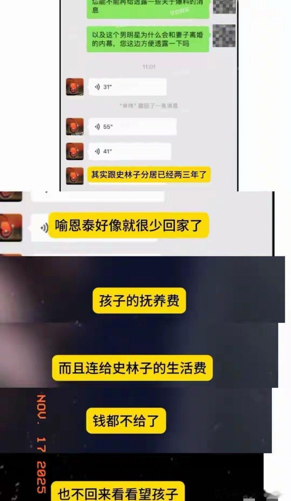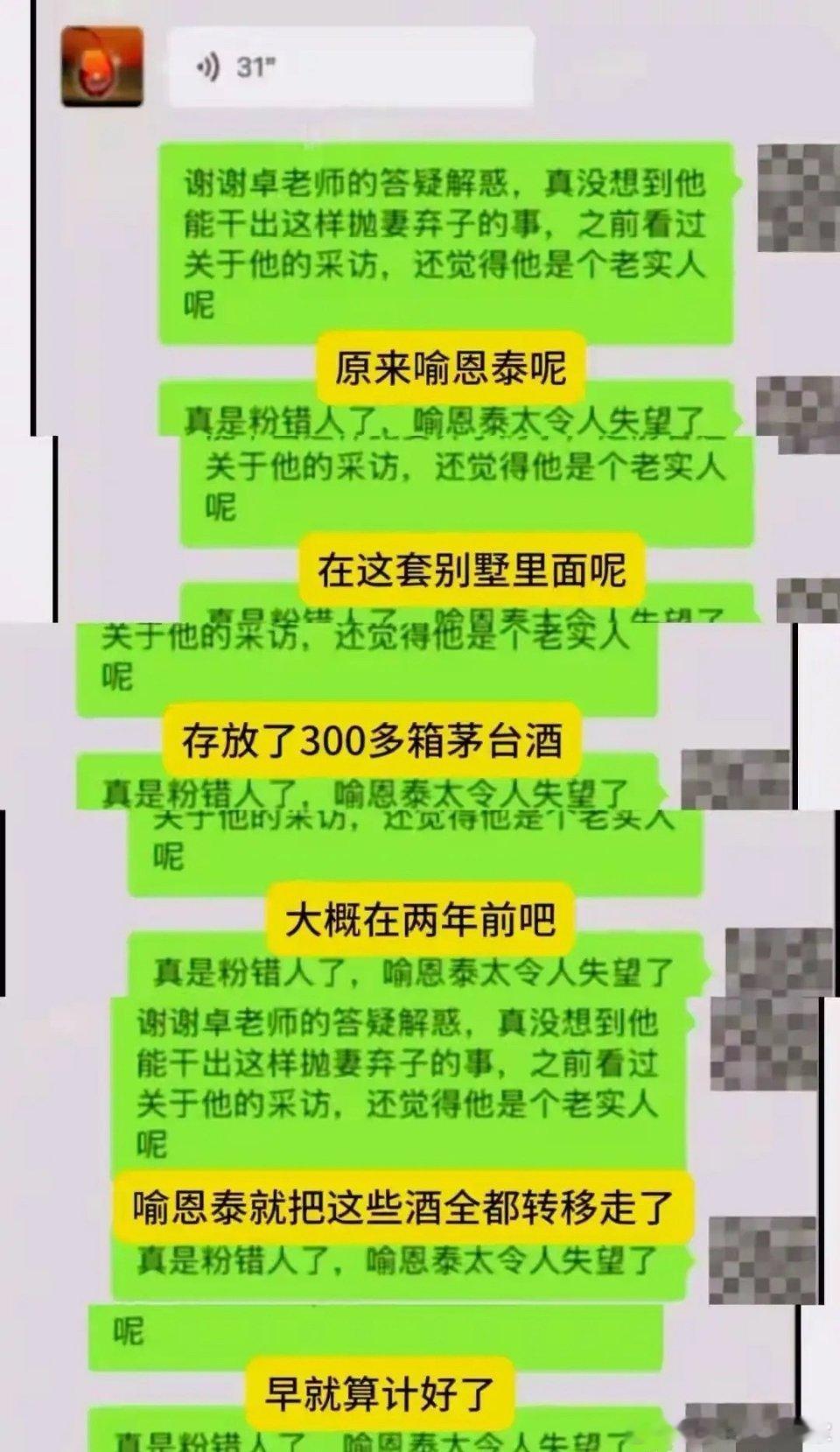 卓伟爆料喻恩泰婚变内.幕,称喻恩泰与妻子史林子已分居2-3年,离婚诉.讼二次开.庭,喻恩泰未露面。离婚原因有两点:一是喻恩泰近两年停付妻子生活费、子女抚养费以及房租,史林子从高档公寓搬至普通小区,环境很一般,夫妻名下没有多少财产,也没有房产,仅剩一辆自.购.车,还是史林子婚前所购入。二是数月前喻恩泰拉.黑妻子致失联,也不回家看孩子,史林子无奈只能起.诉。据悉,两年前喻恩泰已从史林子的别墅里搬走了300多箱茅台,应该是早有打算。之前还觉得他是老实人,没想到能干出这种事。
