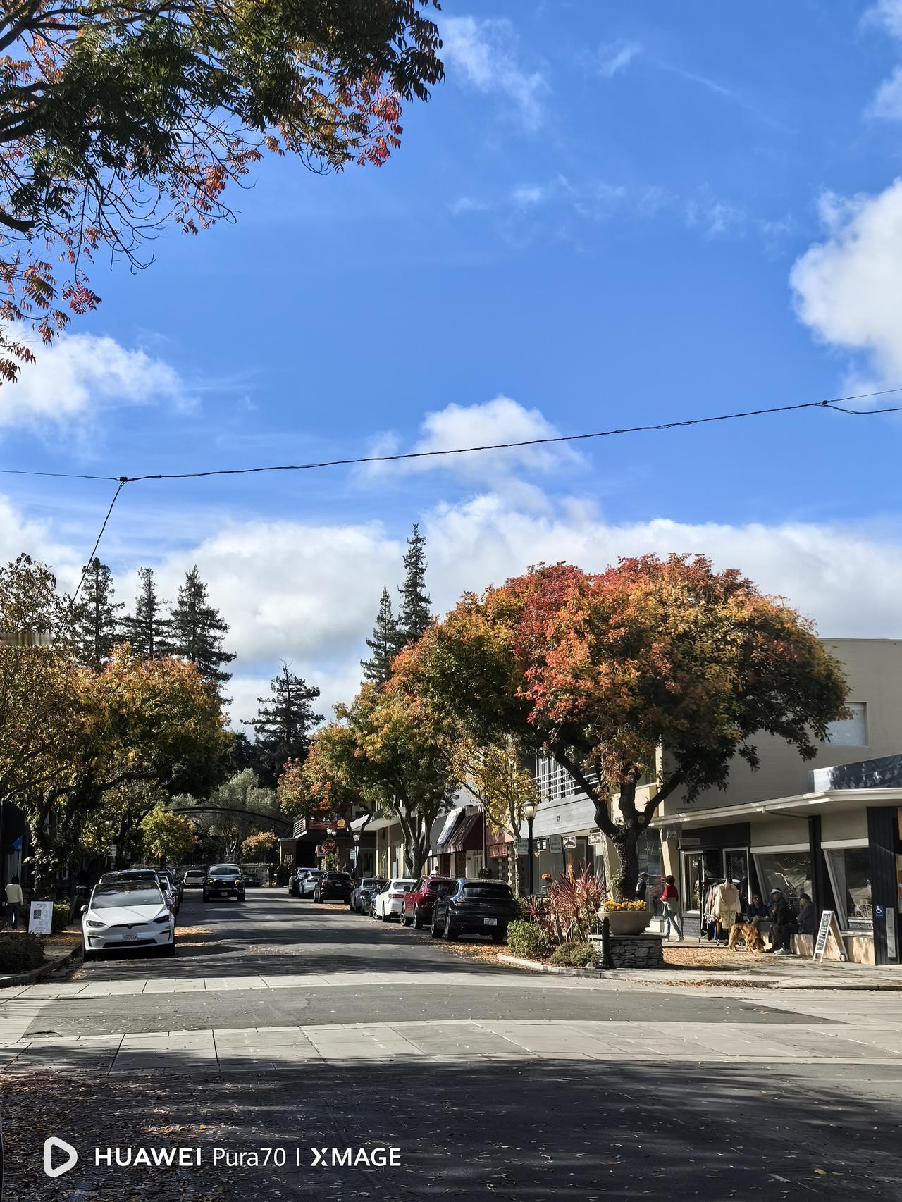 Altos)小镇,和位于斯坦福大学旁的鲍登街( Bowdoin Street)。初冬时节,街道两旁的树叶逐渐转为金黄与深红,并洒在地上,走在宁静的小道上,感觉是在画中游。这里没有尘世的喧嚣,阳光在树影间闪动,使整条街呈现出一种温柔、慢节奏的美感。 我们在小镇街边上,随便找了一家咖啡店,喝着咖啡,欣赏着美景,这样的生活还是很惬意的。