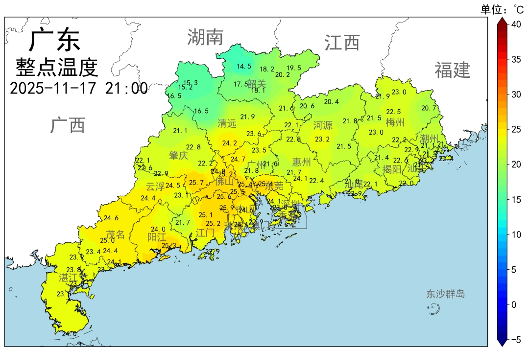 截至周一晚上9点,强冷空气正在影响广东粤北地区。清远,韶关北部地区正在出现4-6度降温。