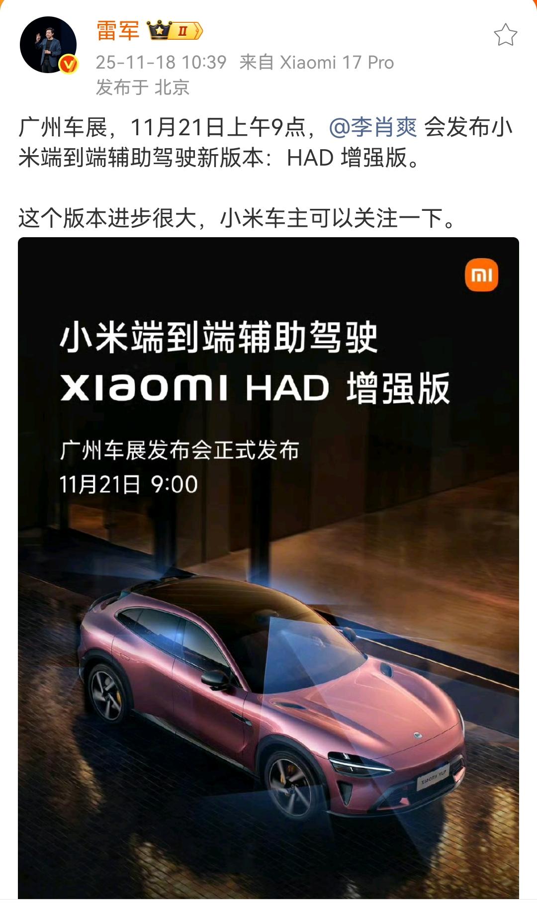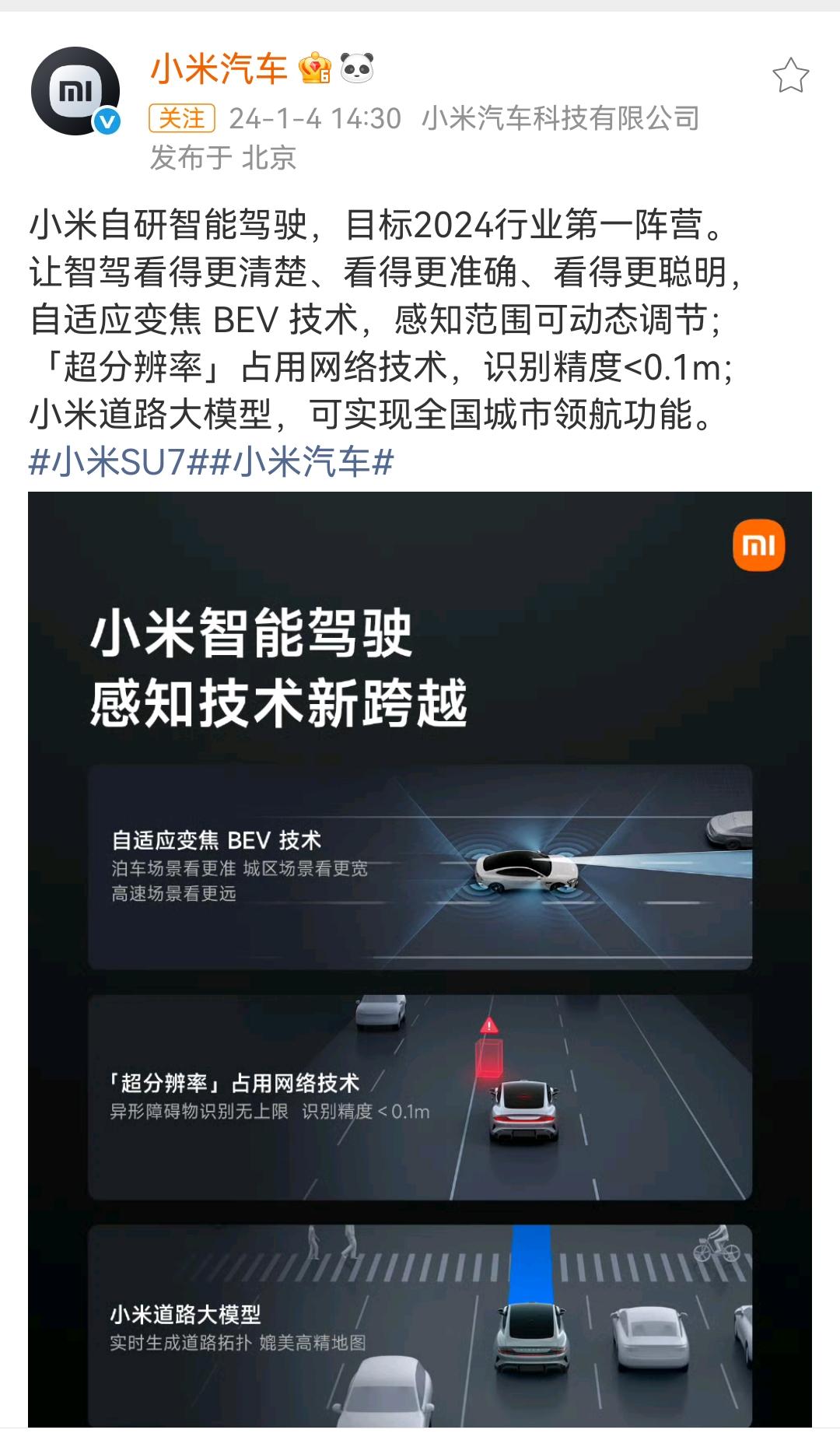 雷军:小米端到端辅助驾驶新版本:HAD 增强版,这个版本进步很大,小米车主可以关注一下! 小米自研智能驾驶,目标2024行业第一阵营,不知道这个2023年年底立下来的flag,现在算不算完成了。 从目前看,小米好像不太宣传自己是不是智能驾驶第一阵营的,搜索雷军的个人微博也搜索不到相关的内容,但是小米汽车可以搜索到相关的内容。 各位是怎么看的?欢迎评论区留言。
