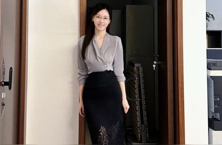 性感气质美女穿棕外套配黑裙黑丝,拎黑包踩黑鞋,在绿植背景下笑容优雅,尽...