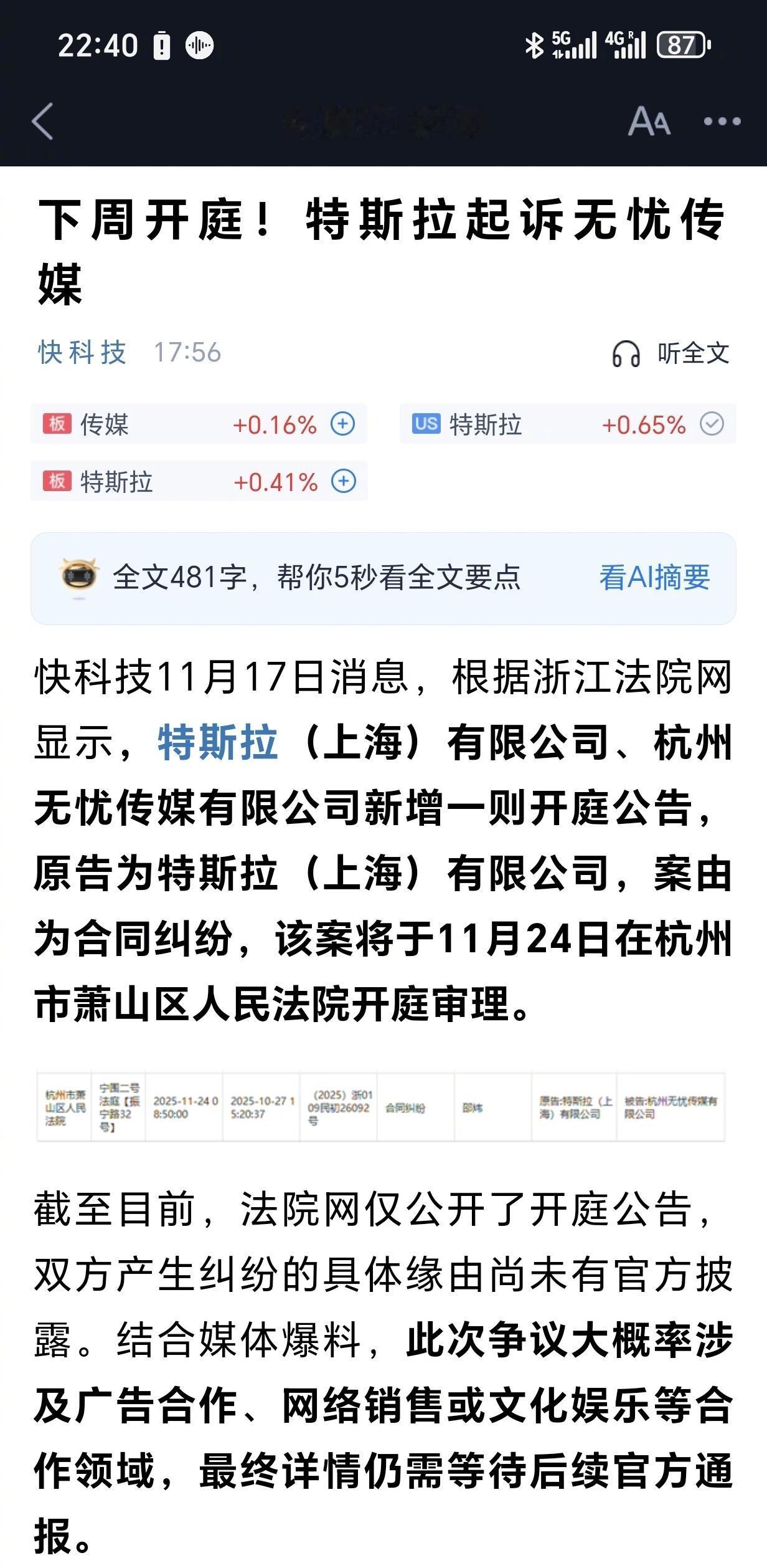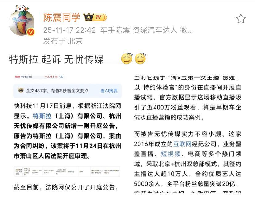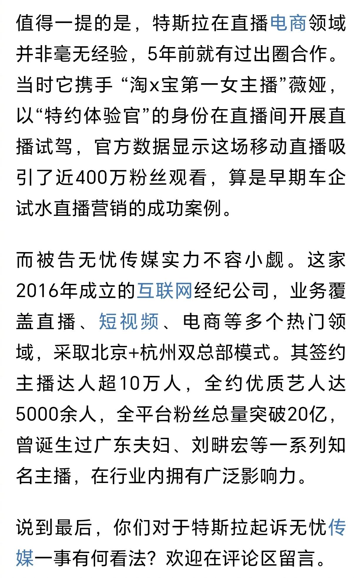 陈震:特斯拉 起诉 无忧传媒…… 这还真的非常有意思,不过起诉无忧传媒究竟是什么内容,外界还不知道,不知道到时候有没有媒体可以扒出来,比较详细的起诉内容。 无忧传媒是国内一家非常大的媒体运营公司,运营的非常的成功,旗下也有多名艺人明星的签约,累计签约人数已经超过了10万人。 各位是怎么看的?欢迎评论区留言。