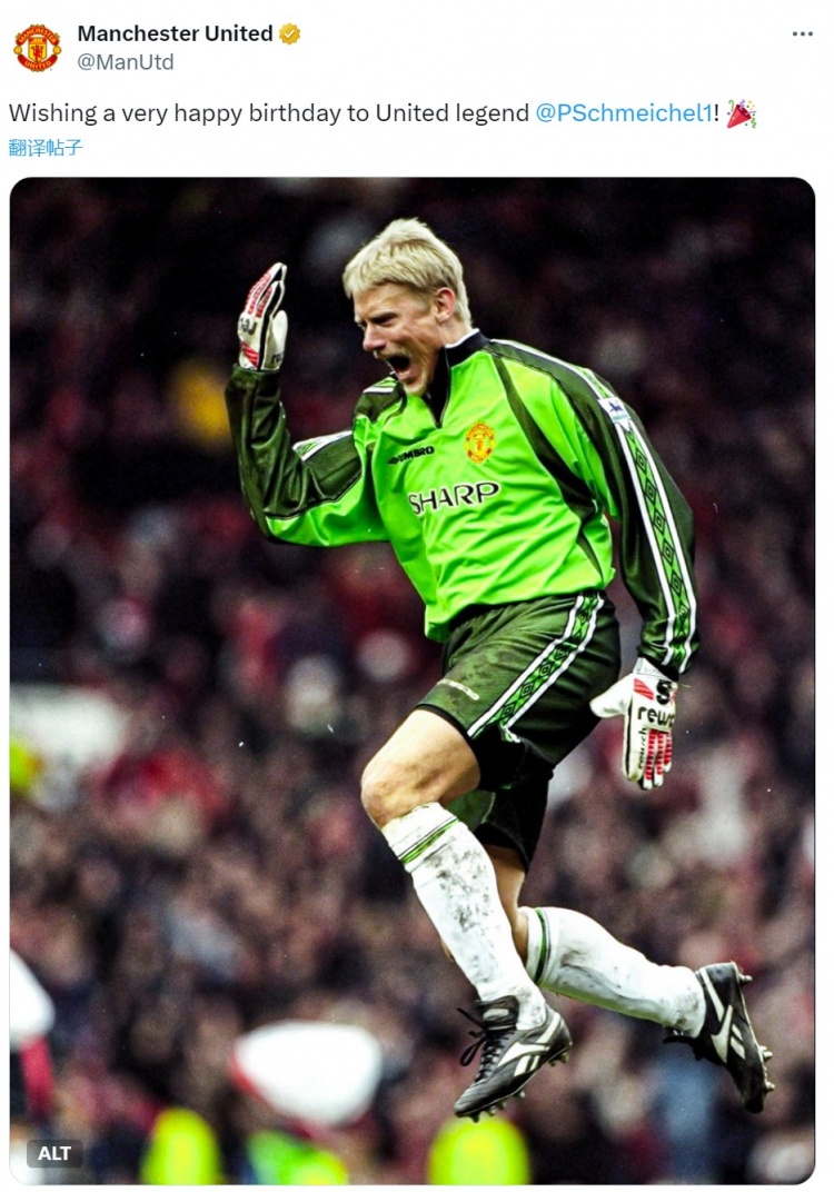 曼联官方社媒晒出舒梅切尔效力球队时期的照片,配文:“祝曼联传奇舒梅切尔生日快乐!”