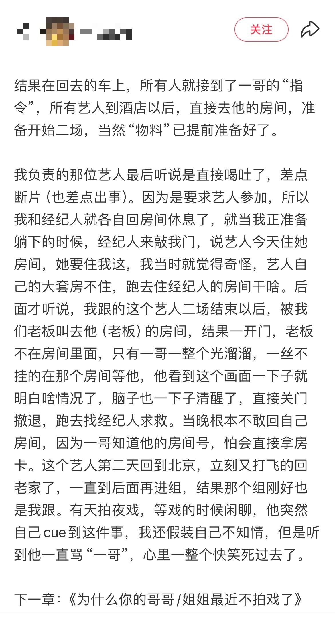 吃到一个惊天大瓜:曝曾爆红一哥酒后潜规则,但没人猜得出来是谁公司爆红一哥走红后性情大变,热衷劝酒,某品牌晚会后经老板变相安排,艺人被诱至房间,却发现一哥一丝不挂等候,遭遇潜规则试探,艺人受惊逃离…大家有谁能猜到吗,蹲个后续