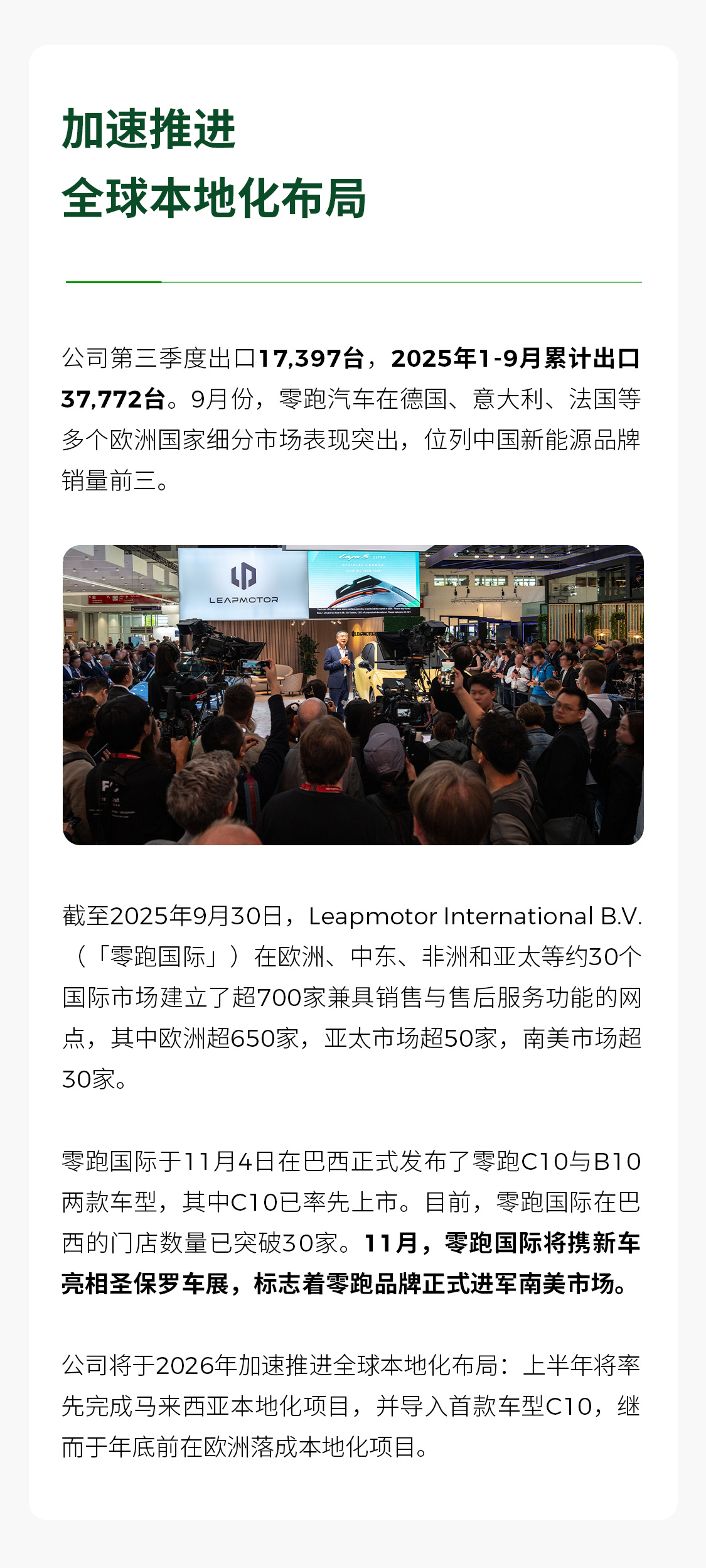 季度连续盈利,零跑三季报来了,第三季度盈利1.5亿,较2024年同期交付量增长101.8%,验证了“零跑模式”的成功,把自主研发到销量转化,再到盈利反哺研发投入这条路,真正的走通了!零跑能够从众多新势力中的竞争中脱颖而出,活下来并且活的越来越好,有时代的红利,也有其必然的道理,总结起来其实也很简单:1.坚持全域自研,利用技术优势构建护城河,在同级别的车型上提供越级的配置,消费者的获得感独一无二2.规模效应带来的“好车不贵”,零跑这大半年恐怖的销量增长让零跑在成本上的优势进一步扩大,反哺到消费者的体验就是配置高,价格也香!随着后续销量的持续增长期,这个优势也会越来越明显3.全车型覆盖,从已经验证过的B系列和C系列,已开启预售的电动高尔夫Lafa5,再到即将在广州车展亮相的全球车型A10,更不用说明年还有的MPV等车型,可以看出零跑造车的理念与消费者需求的契合,还有零跑强大的车型研发能力。汽车市场消费者的需求是多样化的,教育用户是一种方式,迎合用户同样是,这一点零跑显然是目前新势力中做的最好的4.全球化布局,零跑在海外的布局也是“领跑”的,这边在国内市场厮杀的同时,早已向外布局,多款车型从设计之初就具备了全球化的品质,B系列首款全球车B10底盘由Stellantis联合调校,整车符合53个国家及地区的法规要求,实现针对不同市场精准适配,严苛的标准不但可以助力品牌出海,还可以让国内外消费者体验到零跑制造的高品质,所以上市即引爆市场,持续热销超8万台,同时在法国全球媒体试驾中,获30国超200家权威媒体一致好评。零跑在今年的优秀表现,除了以上几点,更多的是对消费者需求及市场变化的精准预判,进而着力打造自身的品牌护城河。这才让我们看到“月销7万”,“提前完成50万销量目标”的成绩。真正恐怖的是,零跑手里的牌还有很多的,11月27日上市的Lafa5,全新的A系列,旗舰全尺寸SUVD19都有着极高的爆款潜质。而在这些产品加持的情况之下,明年销量破百万也是大概率的事件!还在讨论车企如何能走上正轨,不如看看零跑,这个样,已经打好了!