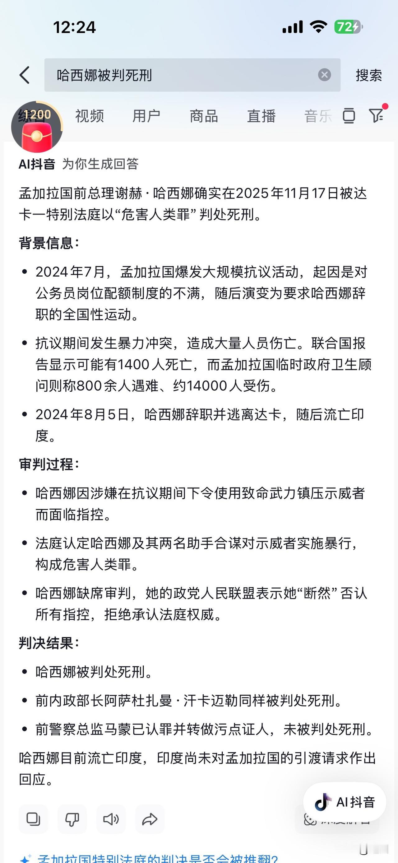 近日小编了解到,孟加拉国前总理在2025年11月17日被“危害人类罪”判处死刑。 后因为去年8月24日流亡到印度🇮🇳,孟方以提出请求引渡。 该女总理5次当选总理且暴政不断,引起了社会骚乱。孟加拉清算