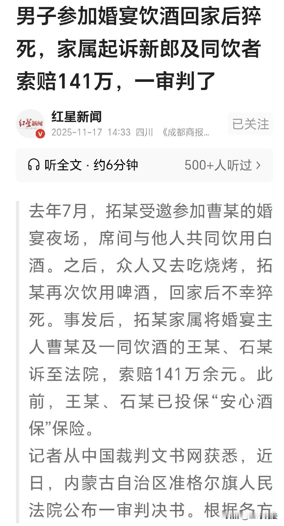 内蒙古,一男子受邀参加婚礼夜宴,他和朋友坐在一桌,男子一时高兴,喝下数杯白酒,谁知夜宴结束,男子不想回家,他又约来另一个朋友,三人一起到烧烤摊上闲聊,朋友要了6瓶啤酒,男子少喝了一点,提前起身回到了家中,谁知第二天妻子发现,男子猝死,家属告到法院,要求新郎和两个朋友赔偿141万,法院这样判了! 2024年7月6号晚上,拓某接到了曹某的邀请,曹某举办婚礼,他大摆宴宴,宴请了各路亲朋好友。 拓某作为曹某的朋友,自然会为朋友的婚礼恭喜助兴,因为来的人数很多,婚礼当天,又摆了几桌夜宴。 朋友们到场之后,互相道着寒暄,之后他们齐坐在一堂,恭贺着新人幸福美满。 平时大家都各自忙碌,借着这个机会,终于能够欢聚一堂。 桌子上菜品高档,飘着香气,白酒饮料更是不能缺席,大家喜气洋洋,当时就打开白酒斟上。 拓某今年40多岁,身体一直看着犇棒,他在前一年8月,还参加了一次职业健康检查。 检查结果中显示,拓某并没有心脏方面的基础病症,参加夜宴的晚上,他和同样受邀的石某被安排在了同一桌上。 席间大家热热闹闹,互相提议来喝白酒,拓某也举起酒杯,他和朋友石某坐在一个桌上。 俩人边聊边喝,一晚上下来,拓某喝了有4杯半左右。 婚宴夜场上欢声笑语,结束后大家依旧意犹未尽,拓某和石某相约,俩人一起离开了酒店。 可拓某没想着回家,又给朋友王某打去了电话,约着去万通小区附近吃烧烤。 王某十分的高兴,急急匆匆就赶来聚餐,三个人落座之后,海阔天空的聊了一会,在这期间,王某点了6瓶啤酒。 拓某看啤酒送来,他又忍不住喝了一点,不过他没喝多少,就觉得有些困乏,脑子昏沉,立刻就想躺下休息。 他向朋友告别,提前起身回到了家里,他到了家里,倒头就睡,一觉就睡到了第二天清晨。 石某王某没有多想,更没有察觉出有什么异样,可是万万没有想到,这竟然是他们最后一面,要知如此,无论如何他们也不会停留。 第二天时候,拓某依旧睡着不起,妻子以为他喝酒多了,急急忙忙喊着他起床。 谁知喊了又喊,拓某还是毫无动静,妻子这才发现他不对劲了,赶紧拨打了急救电话。 医生赶到确认,拓某为心源猝死,妻子嚎啕大哭,怎么好好的人说没就没了那? 妻子回忆起昨日,丈夫拓某说要晚点回家,他去参加一场婚宴,谁知道回来睡了一宿就猝死了! 家属悲痛万分,觉得这事和婚宴主人以及和他一起喝酒的人脱不了干系。 2025年4月,拓某家属告上法庭,要求新郎曹某、同饮者石某和王某赔偿141万元。 石某和王某倒吸一口凉气,他们没有想到,当初二人一起在保险公司购买的“安心酒保”个人责任保险如今起了作用。 这份保险专门约定,要是被保险人在多人聚餐时,因为自己的过失造成第3者人身伤亡,经法院判决需要赔偿的,保险公司会在保额内承担责任。 王某的保险限额是100万,其中人身伤亡每次最多赔30万。 石某的保险限额是50万,其中人身伤亡每次最多赔20万。 王某石某的两份保险的期限,刚好覆盖了这件事发生的时间。 因此家属在起诉中要求判令保险公司在保险范围内承担赔偿责任。 《民法典》第1165条规定: 行为人因过错侵害他人权益造成损害的,应当承担侵权责任。 曹某作为婚宴组织者,未对宾客饮酒尽到提醒劝阻的安全保障义务,存在过错。 石某参与两场酒局却未劝阻拓某持续饮酒,王某明知拓某已喝多仍赴约且不劝阻,二人也存在过错。 《民法典》第1173条规定: 被侵权人对同一损害的发生或者扩大有过错的,可以减轻侵权人的责任。 法院认为,拓某是具备完全民事行为能力的成年人,即便无心脏基础病,也应当知晓过量饮酒对自身健康的潜在风险。 他在婚宴喝了4杯半白酒后,又去吃烧烤时继续饮酒,对自身饮酒行为和风险未加节制,是导致心源猝死的主要原因。 《民法典》第1198条规定: 宾馆、商场、银行、车站、机场、体育场馆、娱乐场所等经营场所、公共场所的经营者、管理者或者群众活动的组织者,未尽到安全保障义务,造成他人损害的,应当承担侵权责任。 婚宴属于个人大型宴请,曹某作为婚宴的邀请人和组织者,并非仅负责筹备宴席即可。 他还需要对到场的宾客人身安全负有合理注意与保障义务,包括对过量饮酒的提醒、劝阻等。 曹某在举办婚宴时并没有对拓某进行适当的提醒和劝酒,但是,曹某结婚邀请拓某等亲戚朋友,是正常的人际交往行为。 因此,法院判定曹某承担1%的责任,王某承担3%责任,石某承担5%的责任,其余91%的主要责任由拓某自行承担。 保险公司应承担石某5%、王某3%赔偿责任的保险责任。 经法院核定,拓某猝死,具体损失金额应为1391061.3元。 因此,曹某应支付拓某家属13910.6元。 保险公司承担的部分包括石某的69553.1元,王某的41731.8元,共计111284.9元。 关注@王哥说法 多学法律少吃亏!