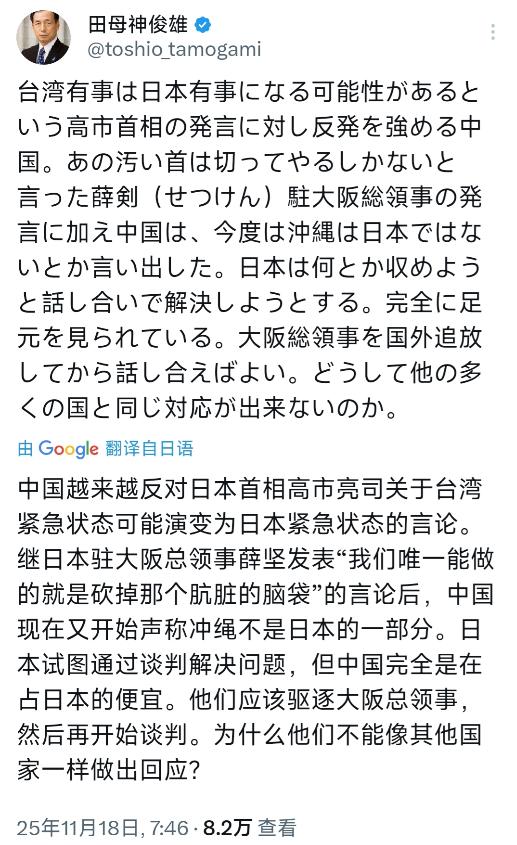 日本航空自卫队前参谋长田母神俊雄今天(11月18日)叫嚣道:“中国越来越反对日本首相高市早苗关于台湾有事可能演变为日本有事的言论。继日本驻大阪总领事薛剑发表‘我们唯一能做的就是砍掉那个肮脏的头颅’的言论后,中国现在又开始声称冲绳不是日本的一部分。日本试图通过谈判解决问题,但中国完全是在占日本的便宜。他们应该驱逐大阪总领事,然后再开始谈判。为什么他们不能像其他国家一样做出回应?” 见过强盗喊抓贼的,没见过偷了东西还嫌主人要得太凶的,日本航空自卫队前参谋长田母神俊雄的叫嚣,把这种颠倒黑白的戏码演到了极致。 一会儿扯台湾有事就是日本有事,一会儿骂中国“占日本便宜”,连自家总领事放了极端狠话都能反过来甩锅,核心就一个歪理:冲绳(琉球)是日本的,中国提一句都算越界。 先掰扯清楚最基本的常识:冲绳从来就不是日本“家传的宝贝”,而是它攥了七十多年的“赃物”。早在日本明治维新之前,琉球群岛上的琉球王国已经存在了几百年,从1372年开始就一直是中国明清两朝的藩属国,年年朝贡,国王继位都要请中国皇帝册封才算名正言顺。那会儿日本连琉球的边都碰不着,更别说宣称主权了。 日本是怎么把这地方弄到手的?1879年仗着国力刚起来,强行派兵吞并琉球,废藩置县改成“冲绳”,这本身就是赤裸裸的侵略。 二战结束后,国际社会早就给日本划清了领土红线,《开罗宣言》明确日本“所窃取于中国之领土”必须归还,《波茨坦公告》更细化到“日本之主权必将限于本州、北海道、九州、四国及吾人所决定其他小岛之内”,这里面从头到尾没提过琉球。1947年联合国都拍了板,把琉球交给美国托管,根本没日本什么事。 现在日本占着冲绳的唯一“依据”,是1972年美国私下里把琉球的“行政管辖权”移交给它。注意,是“行政管辖权”不是“主权”,而且这事儿既没经过联合国批准,也没征求过琉球民众意见,纯粹是两个国家的私相授受。 就像别人托管了你的东西,转头随便塞给路人,路人拿着这个当凭证说东西是自己的,这不是笑话吗?直到今天,国际社会也没哪个权威机构承认琉球是日本领土,这一点田母神俊雄再怎么喊,也改变不了。 更讽刺的是,田母神俊雄一边喊着“日本想谈判”,一边对自己人的极端言论绝口不提。日本驻大阪总领事那句“砍掉肮脏的头颅”,已经突破了外交言论的底线,这种充满暴力煽动的话,换哪个国家都不会容忍。 可到了他嘴里,反倒成了中国“不配合”的理由,要求中国先驱逐自家总领事再谈判,这就好比有人打了你一巴掌,还让你先道歉再跟他讲道理,天下哪有这种道理?