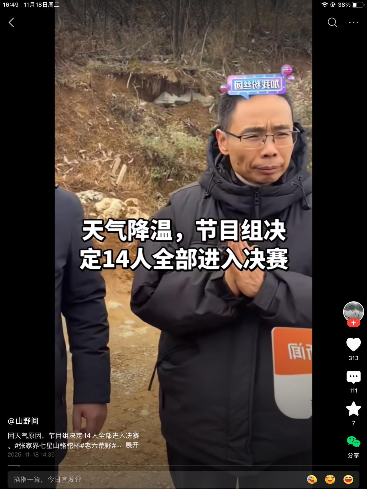 节目组投降了! 天气原因?对!没毛病,也是怕死人吧? 一个个的都拿命在挨,说白了,那几个生存困难的,豁出性命也想拿到奖金。 这个老六白囤了那么多的柴火,七星山荒野求生节目组让这些老六们折服了,剩下的14位选手全部进去决赛。 决赛场地靠下些,能暖和些。每人奖金两万,14名选手都有。山上太冷了,再比下去决赛都没法比了。下雪找物资费劲。千万别冻死了。荒野求生是为了玩的开心,可不是为了求死。节目组也不全是傻子,你看,换玩法了吧? 还好还好。冷美人也不亏,得到了38000的奖金。 预测一下冠军~猜对了来报道。我来,建哥建弟!