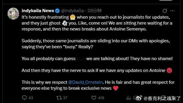 绿帽哥的吐槽:说实话真是让人火大😤——当你向记者打听消息时,他们直接玩消失👻。拜托!我们在这儿苦等回复,结果安托万·塞梅诺的消息突然就爆出来了。那些记者转眼又跑来私信道歉,说自己“太忙了”。真的吗?你们肯定都猜得到我们在说谁!简直不知羞耻!他们居然还好意思问我们有没有安托万的新消息😡这就是为什么我们敬重奥恩斯坦。他行事公允,并且非常尊重所有努力挖掘独家新闻的人