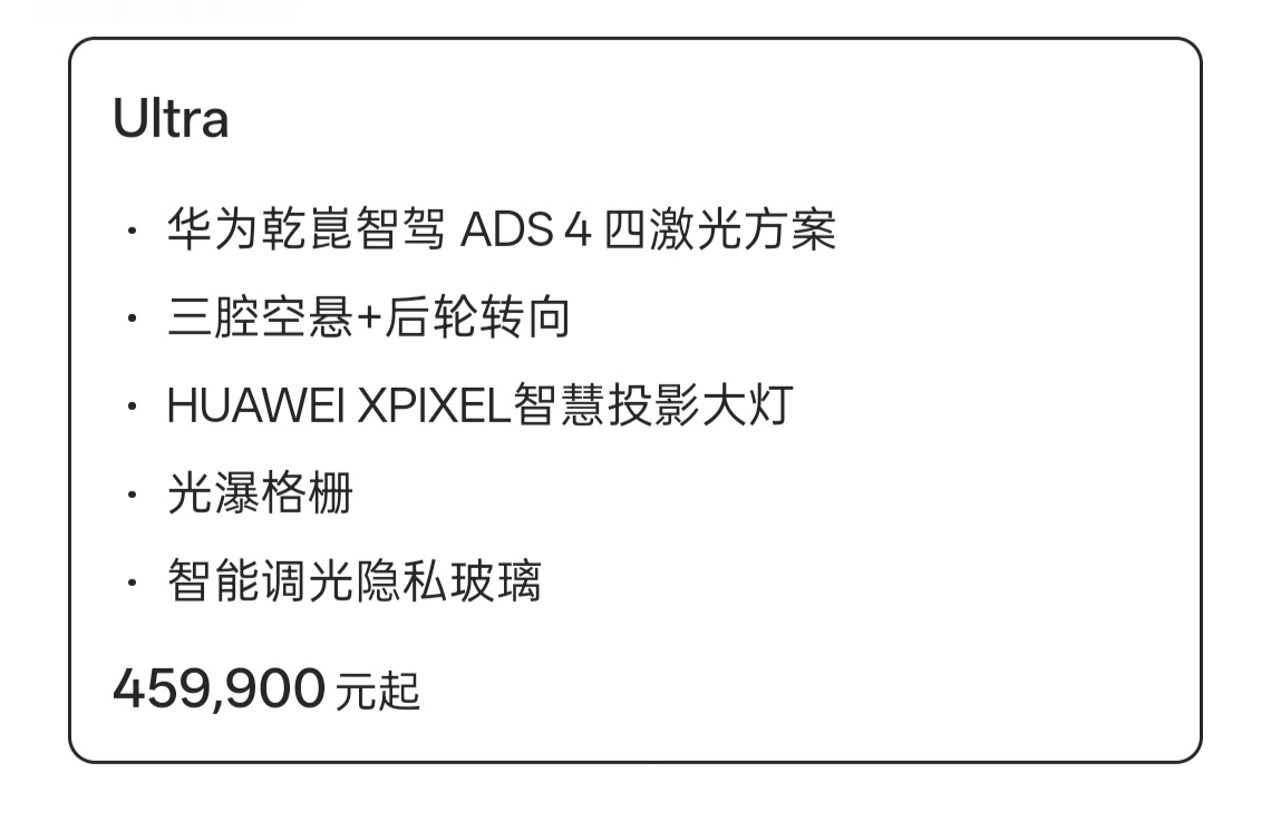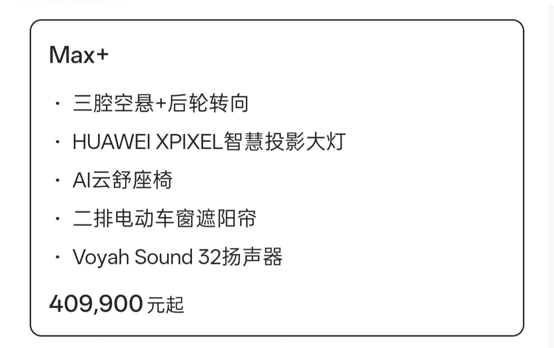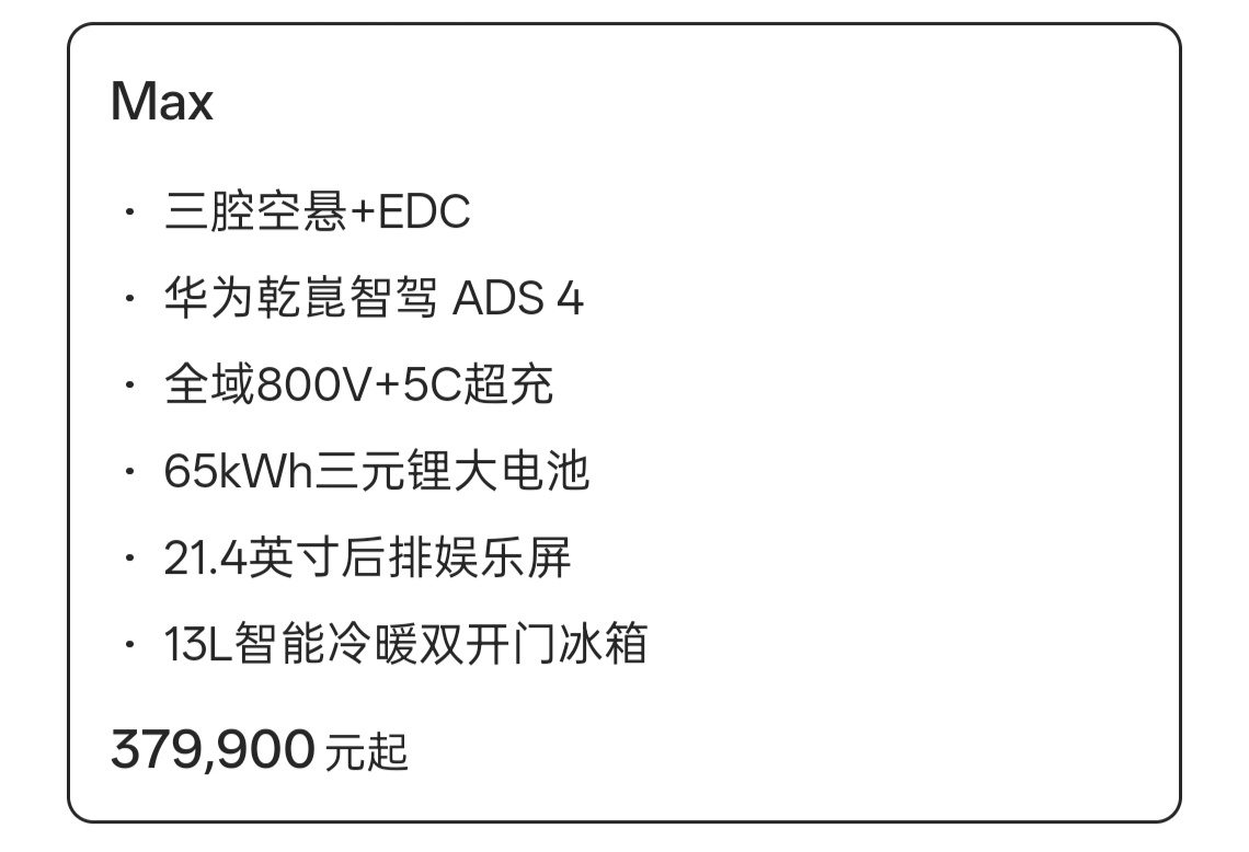 岚图泰山Max:37.99wMax+:40.99wUltra:45.99w黑武士:50.99w配置差异图5、图6、图7图个外观,性价比,最最便宜的 Max 版够了。毕竟三腔空悬、ADS4、5C 超充、65°大电池都给了…