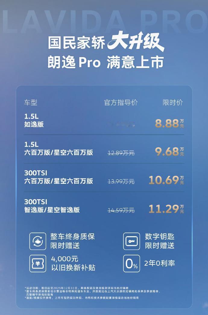 朗逸 Pro 限时 8.88 万起上市,送终身质保、4000 置换补贴。升级点很准:外观像 “小帕萨特”,车长拉到 4720mm;首次上四轮独悬,治好了老款的颠;8155 芯片 + 车载微信,补上智能短板。 现在燃油车仍占近半销量,朗逸 Pro 是把 B 级车的智能下放到十万级,抓的是怕电车麻烦、又想要好体验的用户。但同价位新能源也在卷,它能稳住国民家轿的基本盘吗?