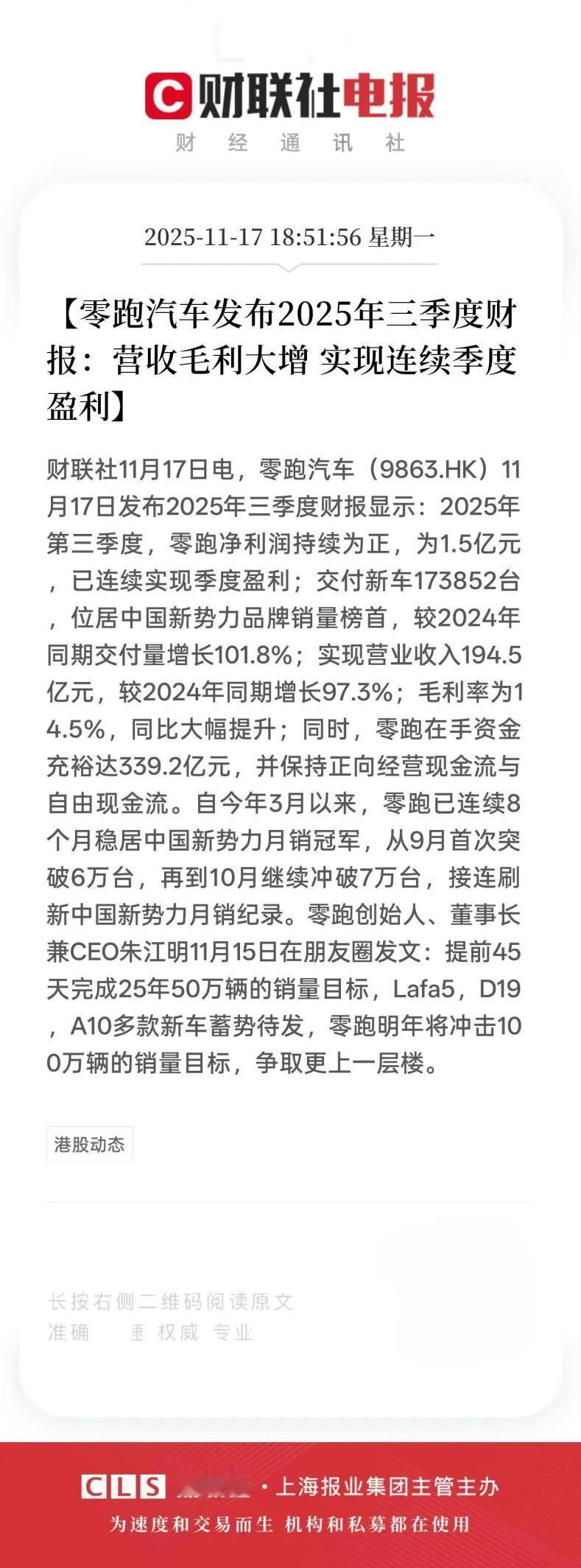 三季度交付超17万台,零跑汽车发布“最强财报”! 日前,零跑率先公布第三季度财报数据,而从中可以看到,品牌在三季度交付为173852台,营收超过194.5亿元,均创下单季度历史新高。并且三季度毛利率达到14.5%,再度实现盈利,企业运营持续保持健康状态。 可以说,从2025年开始,零跑就一直在破纪录,像单月销量就是最好的证据。以第三季度为例,7月和8月是连续突破5万台,到了9月就首次突破6万台,而10月份更是超过7万台,这不仅是连续创造品牌历史新高,放眼新势力阵营也是屡屡刷新纪录,所以现在零跑提前完成2025年度50万台销量目标,成为中国新势力品牌年度销量纪录创造者。 而有这样的市场成绩,零跑C16功不可没,作为现阶段在售车型的旗舰,新车已经实现10万累计交付,在20万内中大型SUV阵营销量榜连续14个月位居第一。更值得一提的是,零跑C16还和2026款C10包揽20万内新能源SUV榜净推荐值(NPS)前两名,这说明整车产品力是得到多数车主的一致认可和好评。 如今购买零跑还有置换补贴最高9000元,并赠送充电桩+整车终身质保,凭借这样的品价比,相信零跑余下两个月还能带来更好的成绩。造车新势力 零跑汽车