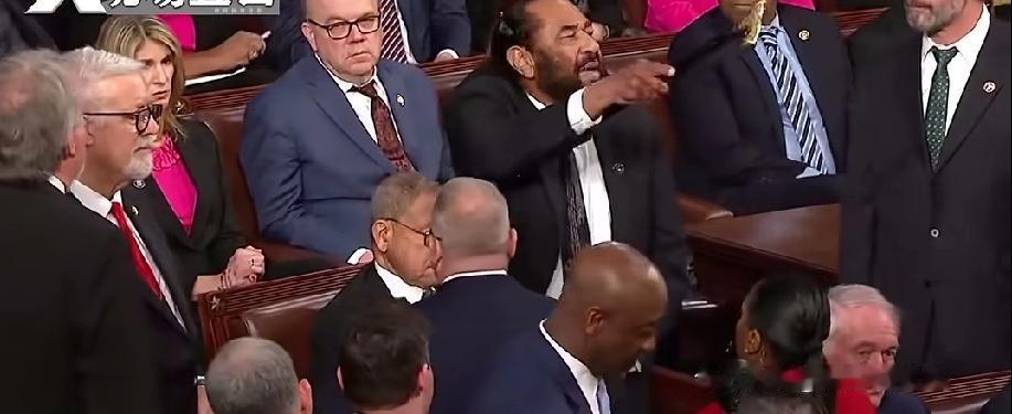 79岁议员拄拐硬刚特朗普,被架出会场仍嘴硬 美国两党互撕又整新活,真实剧情笑不活了!当地时间2025年3月4日,特朗普重返白宫后的首次国会演讲,刚开讲7分钟就被“老对手”民主党议员阿尔·格林搅局。 79岁的格林拄着拐杖突然起身,对着特朗普高喊“你没有授权”,还怒怼他无权削减医保项目,任凭议长约翰逊敲破议事槌警告,硬是不坐下。最后国会警卫没辙,直接把他架离现场,演讲被迫中断。 现场瞬间炸锅:共和党人齐喊“美国”反击,民主党人嘘声连片,不少议员干脆中途离场。这可不是两人第一次结梁子,格林曾两度弹劾特朗普,术后刚康复就赶回国会搅黄共和党计划。被赶后他还淡定表示“为了8000万医保受益者,值了”,后续遭众议院谴责,还放话30天内再弹劾,这梁子算是结死了!网友调侃:“这哪是国会演讲,分明是两党‘呐喊大赛’现场!”