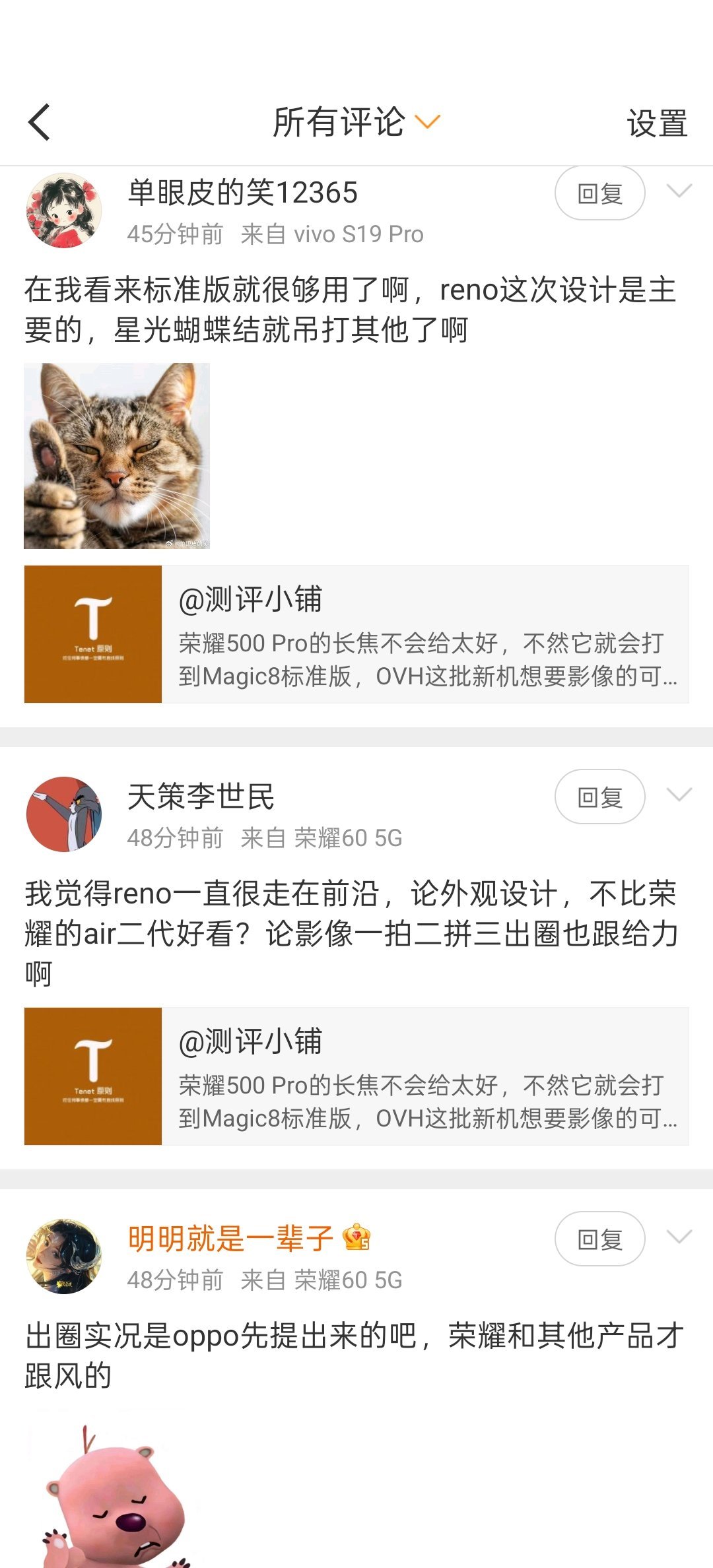 OPPO Reno15 标准版就有潜望式长焦,荣耀 500 连长焦都没配,拍远景、演唱会直接赢麻~而且荣耀的外观果里果气的,怎么总是在模仿啊。reno一直很走在前沿,论外观设计,不比荣耀的air二代好看?论影像一拍二拼三出圈也跟给力啊,在我看来标准版就很够用了啊,星光蝴蝶结就吊打其他了啊!