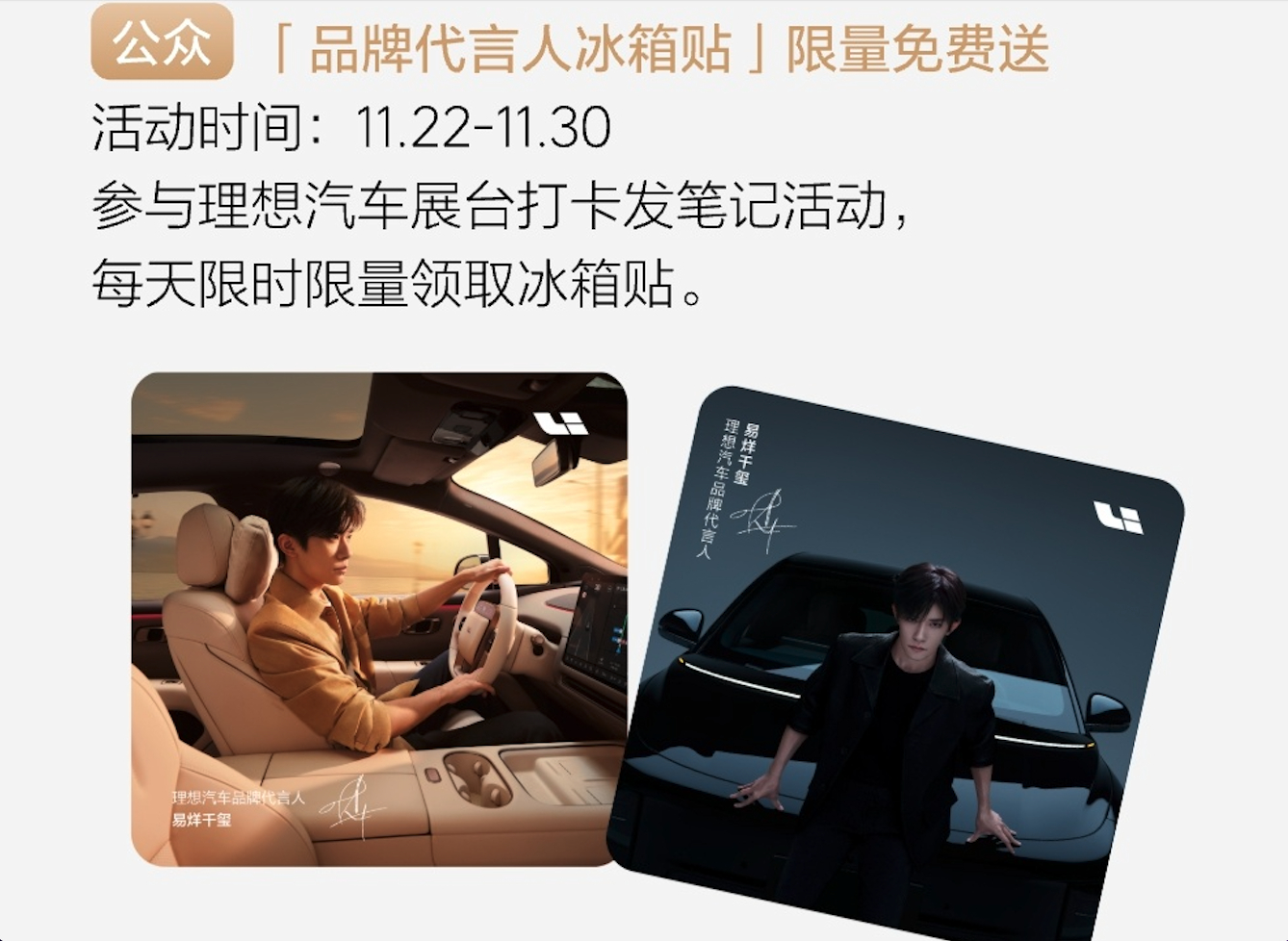 广州车展理想汽车都有啥?媒体日能见到两款特殊涂装的i系列公众日是理想全系车型展出发福利 限量免费送易烊千玺的冰箱贴和水杯车主能得到盲盒和积分理想这次代言可真押对宝了,易烊千玺刚刚获得了金鸡奖最佳男主22号,易烊千玺和舒淇主演的《狂野时代》也会院线上映