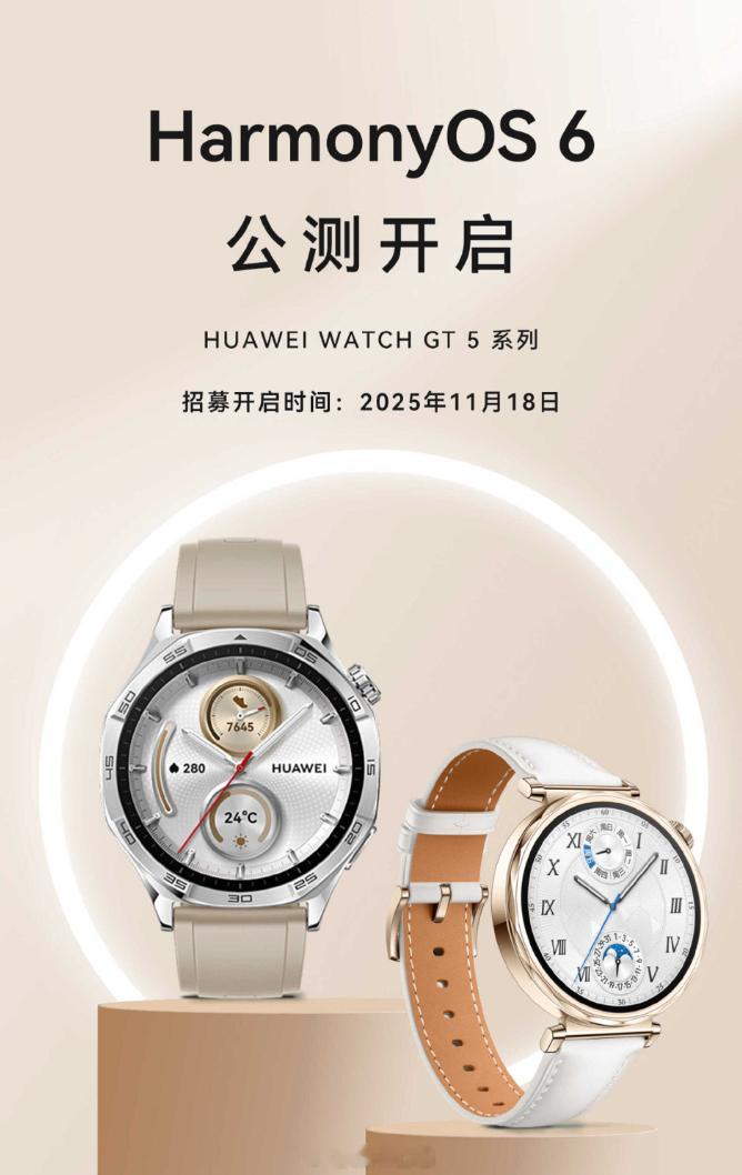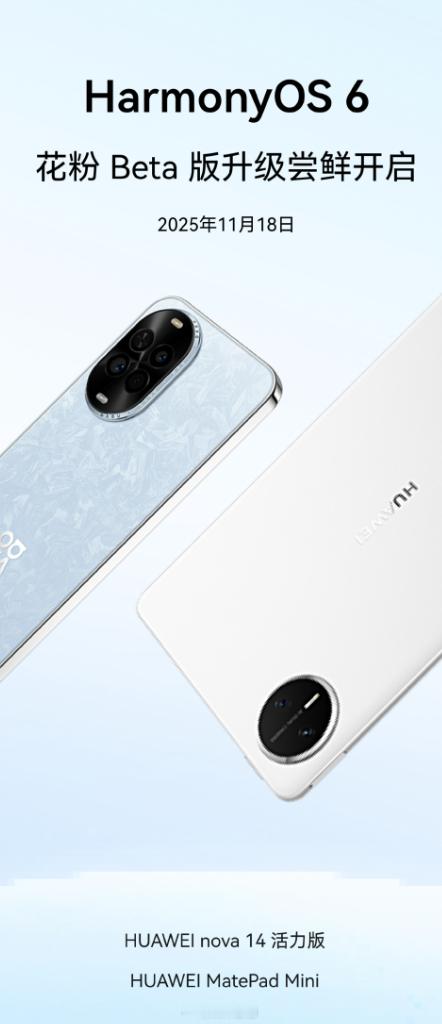 新一批 HarmonyOS 6 公测/花粉 Beta 招募,MatePad Pro 12.2 2025、WATCH GT 5 系列、WATCH FIT 4 系列、nova 14 活力版、MatePad Mini 在列,有机器的可以去报名了。