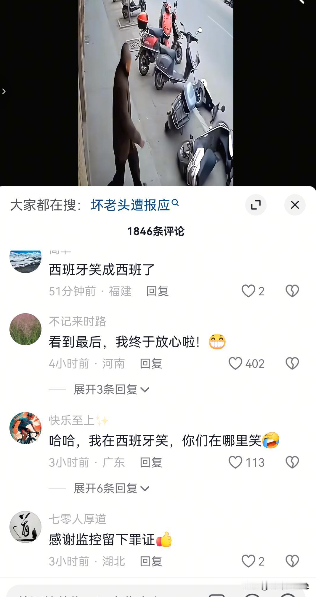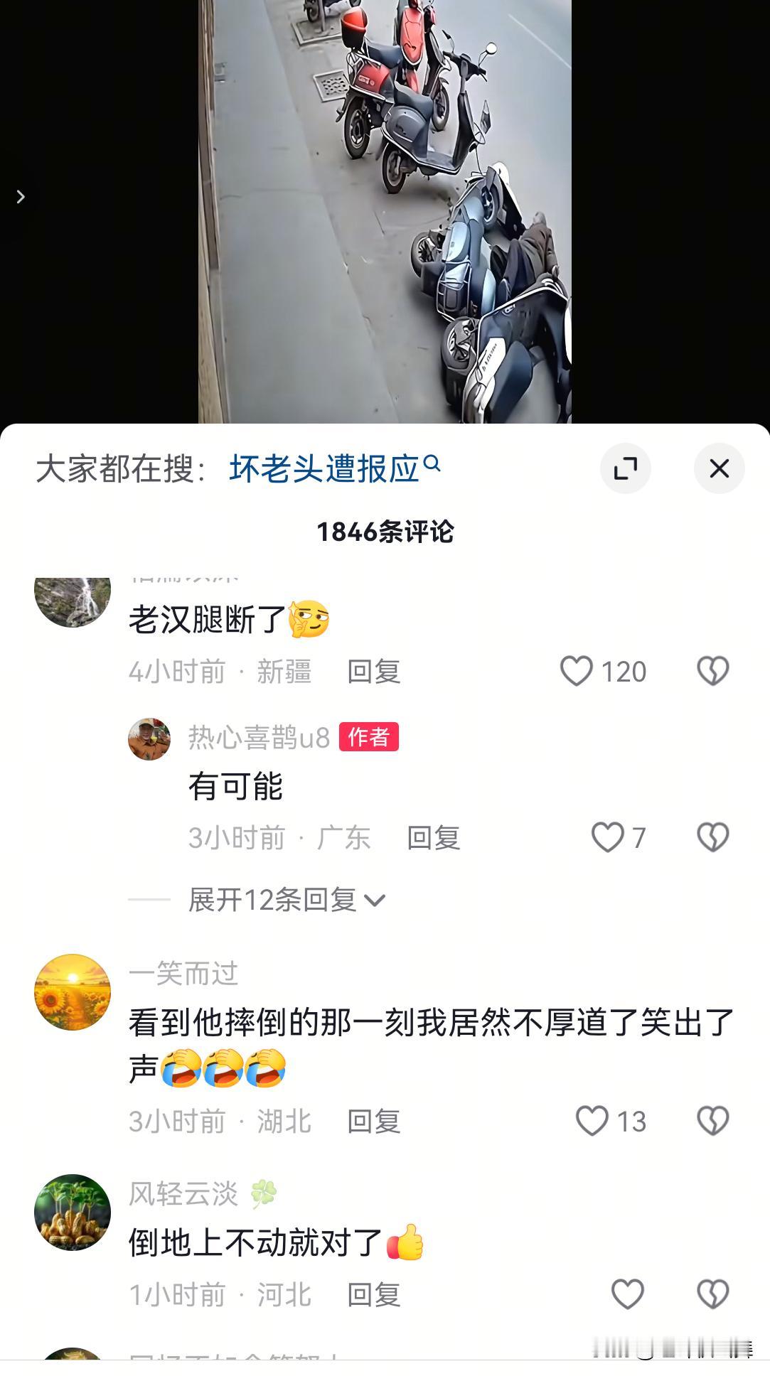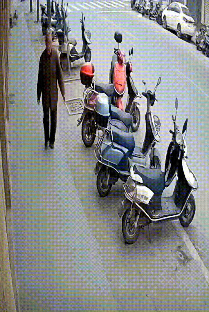 一个老头走人行道上,不知出于什么原因?他走着走着就抬脚开始踢停在路边的电瓶车。看这条路的宽度,电瓶车的停放并没有影响到行人的经过。他边走边踢,谁知突然一下脚踢进了电瓶车后面安装的铁架子里。这让身体在往前走的他瞬间失去平衡,一个倒栽葱摔倒在了电瓶车下。可笑的是,他挣扎了几下没能起来,就用手撑在地上、支起身子大喊:“谁来扶我一下?”网友们看到这里,都笑炸了,没有一个同情他的。最后有没有人扶他不知道,但就这样的老人,真的可能谁扶谁倒霉!特别是那个电瓶车的车主,如果那个老头没什么事还好,如果想网友说的可能腿断了,那绝对会摊上大麻烦。因为这电瓶车,可能真的算是违停(别的城市不知道,在重庆如果车没有停在划线的停车区域内,就是违章。不过重庆几乎每条路的边上都有划线免费停摩托车的地方);其次,这电瓶车装的铁架子属于违规改装。这样算下来,虽然事故是老头故意踢车造成的,但也可能面临麻烦。不过网友们看了是很解气的,对这为老不尊的老人摔倒后喊出那句“谁来扶我一下”时,忍不住笑的停不下来!