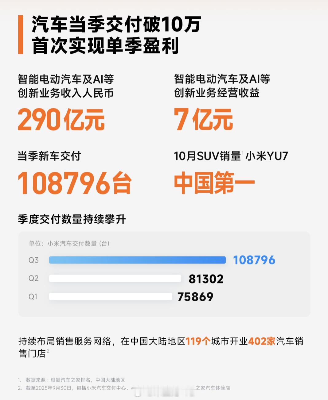 小米汽车的Q3财报也出来了智能电动汽车收入283亿元,其他相关收入7亿元本季度小米汽车及AI等创新业务分部首次实现单季度经营收益转正单季经营收益7亿元现在新势力车企全面利润转正了